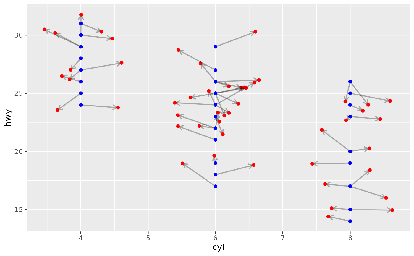 plotting of arrows or segments joining the original position of displaced observations