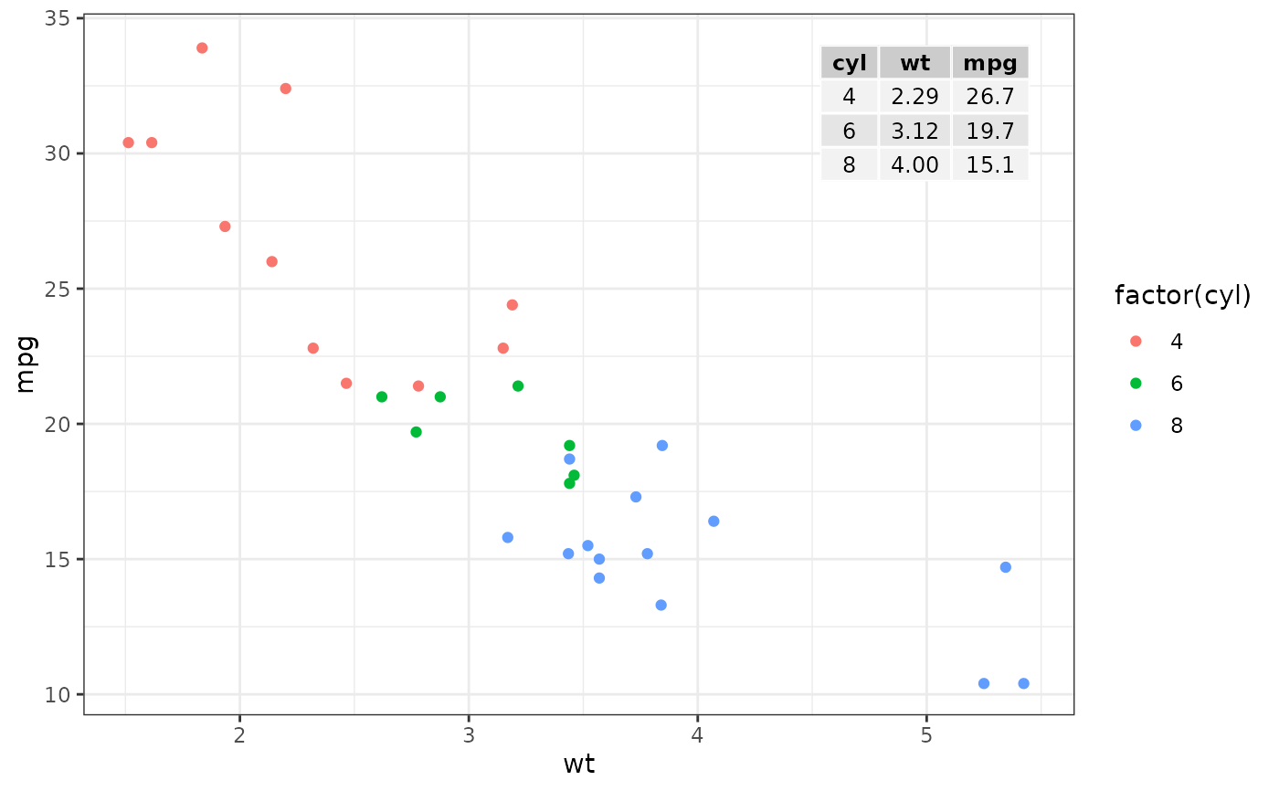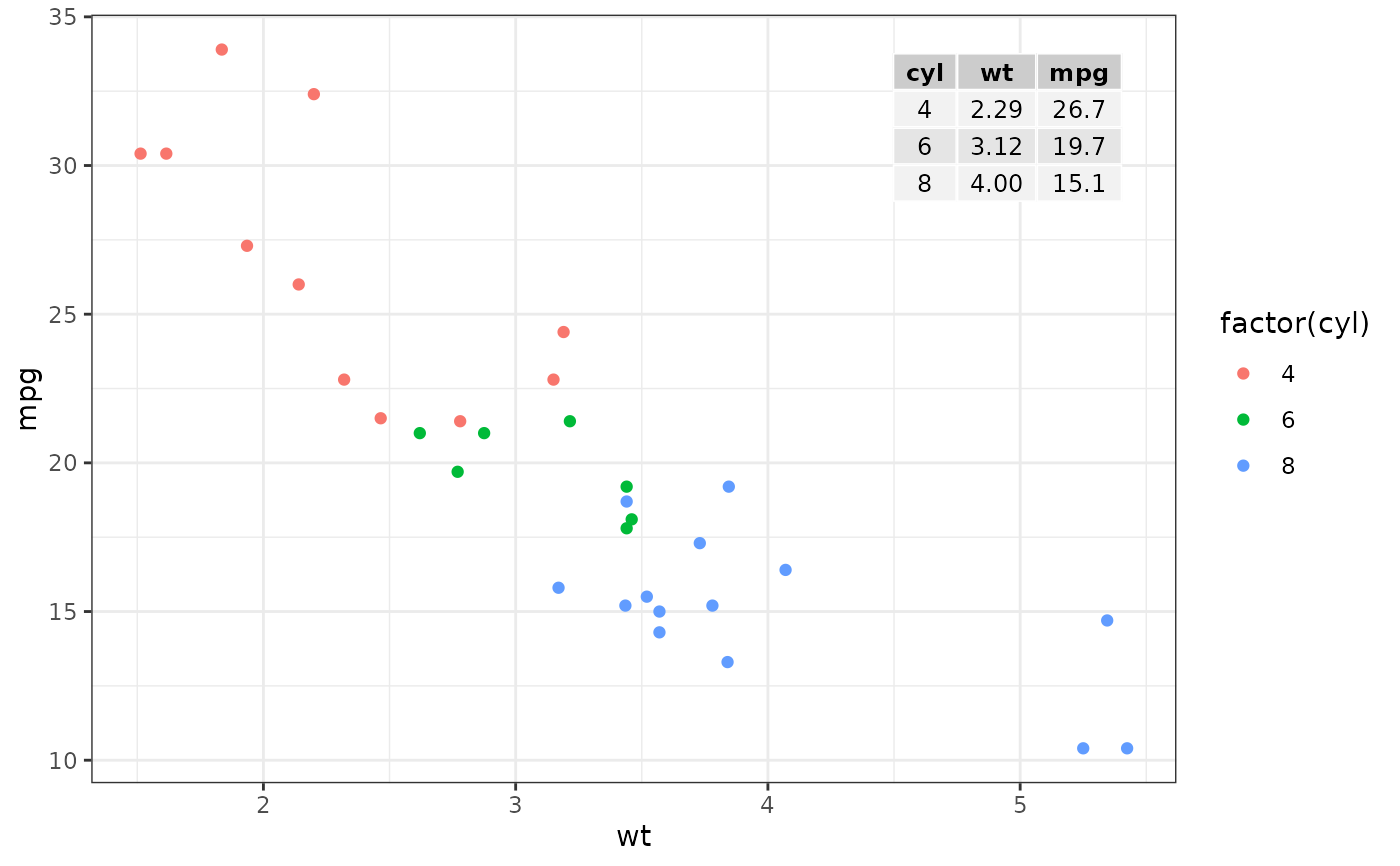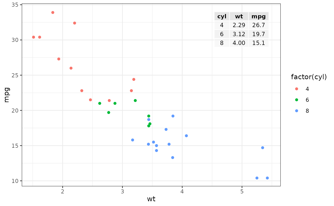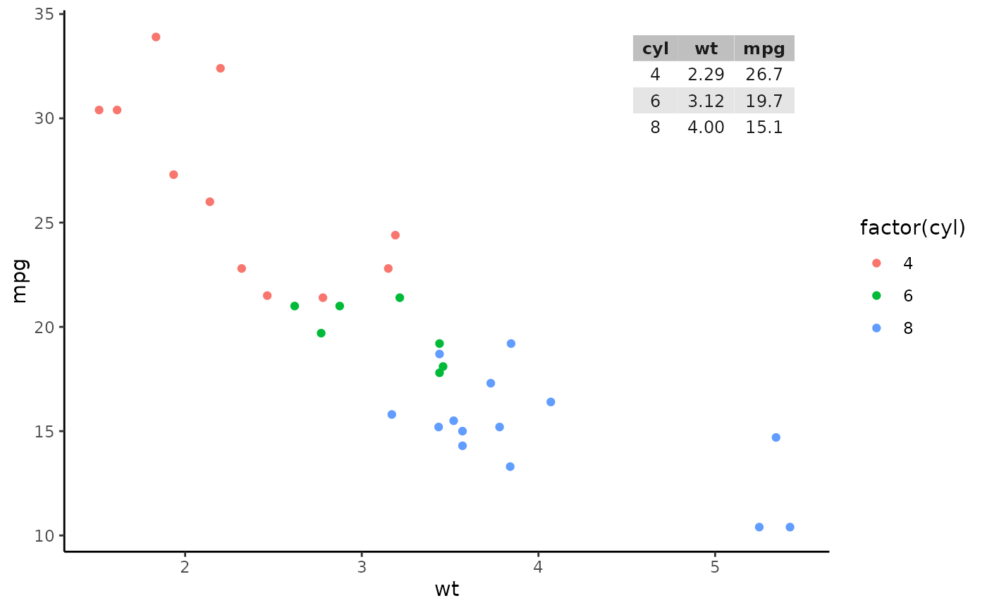 This geometry is inspired on answers to two questions in Stackoverflow. In contrast to these earlier examples, the current geom obeys the grammar of graphics, and attempts to be consistent with the behaviour of 'ggplot2' geometries. https://stackoverflow.com/questions/12318120/adding-table-within-the-plotting-region-of-a-ggplot-in-r https://stackoverflow.com/questions/25554548/adding-sub-tables-on-each-panel-of-a-facet-ggplot-in-r?