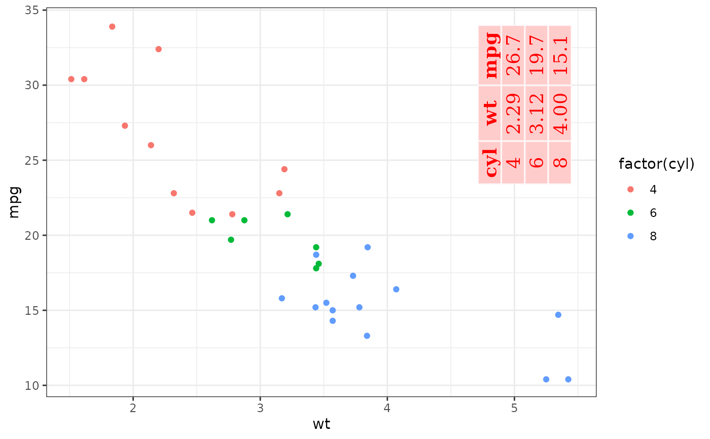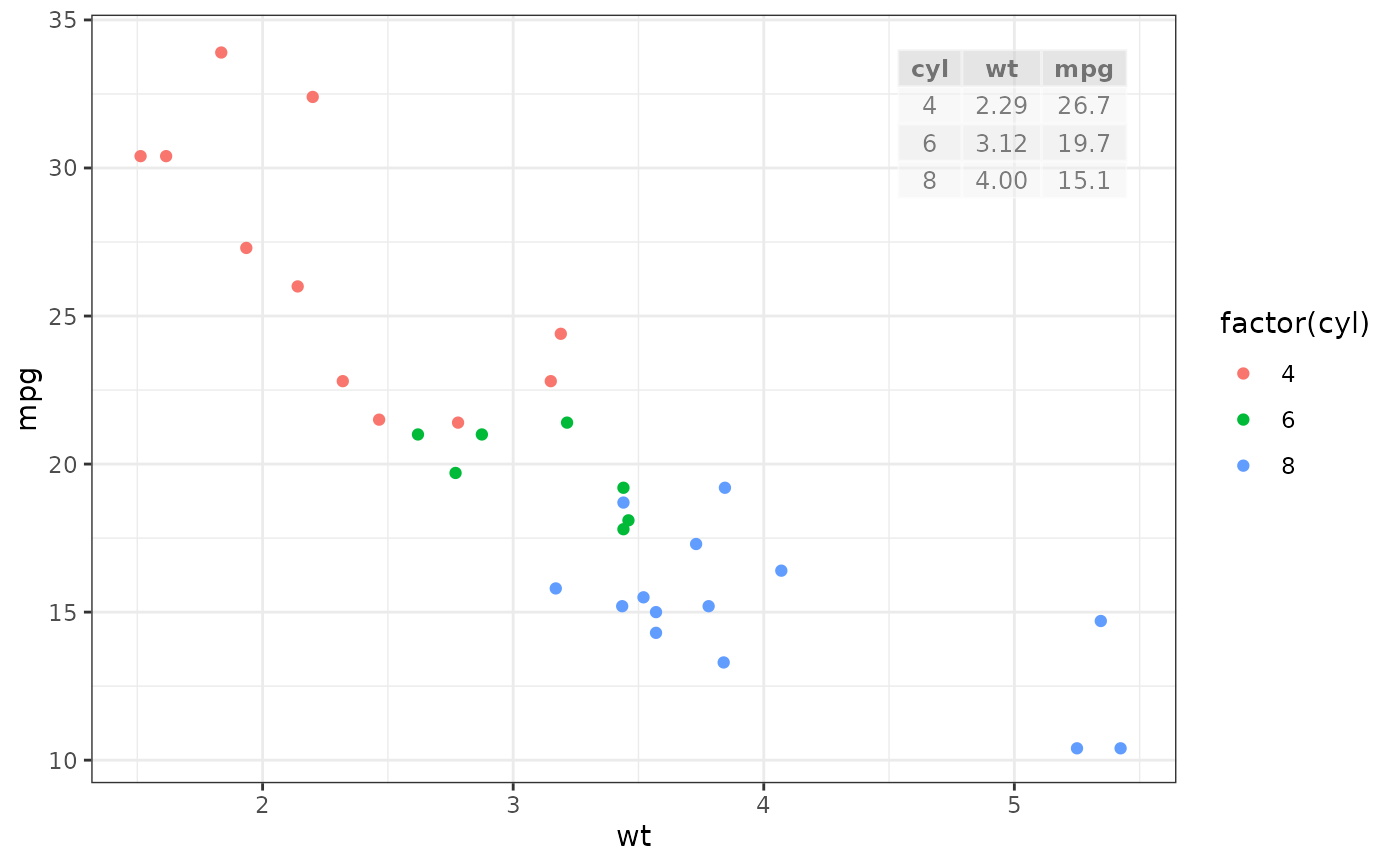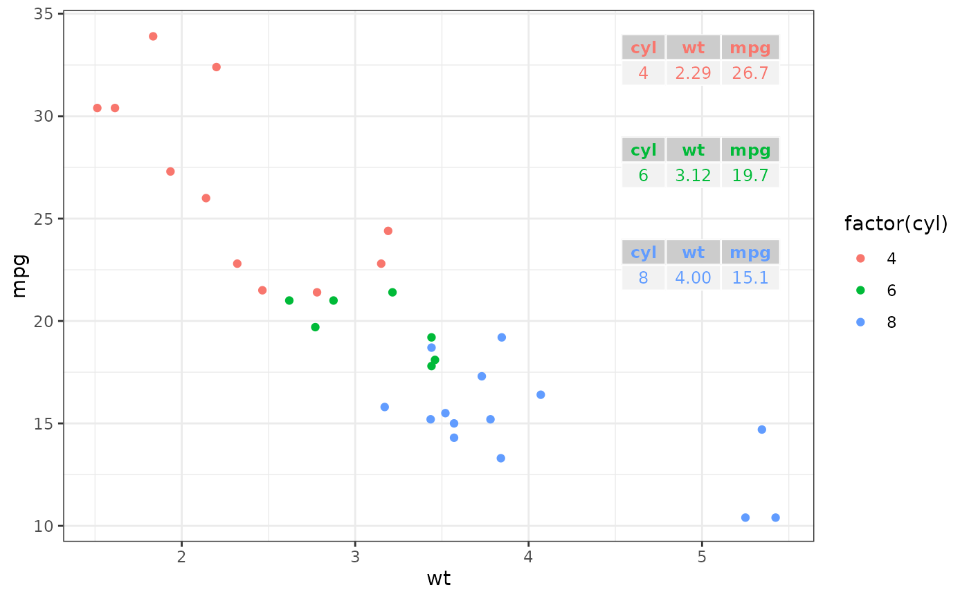 ggplot(mtcars, aes(wt, mpg, colour = factor(cyl))) +