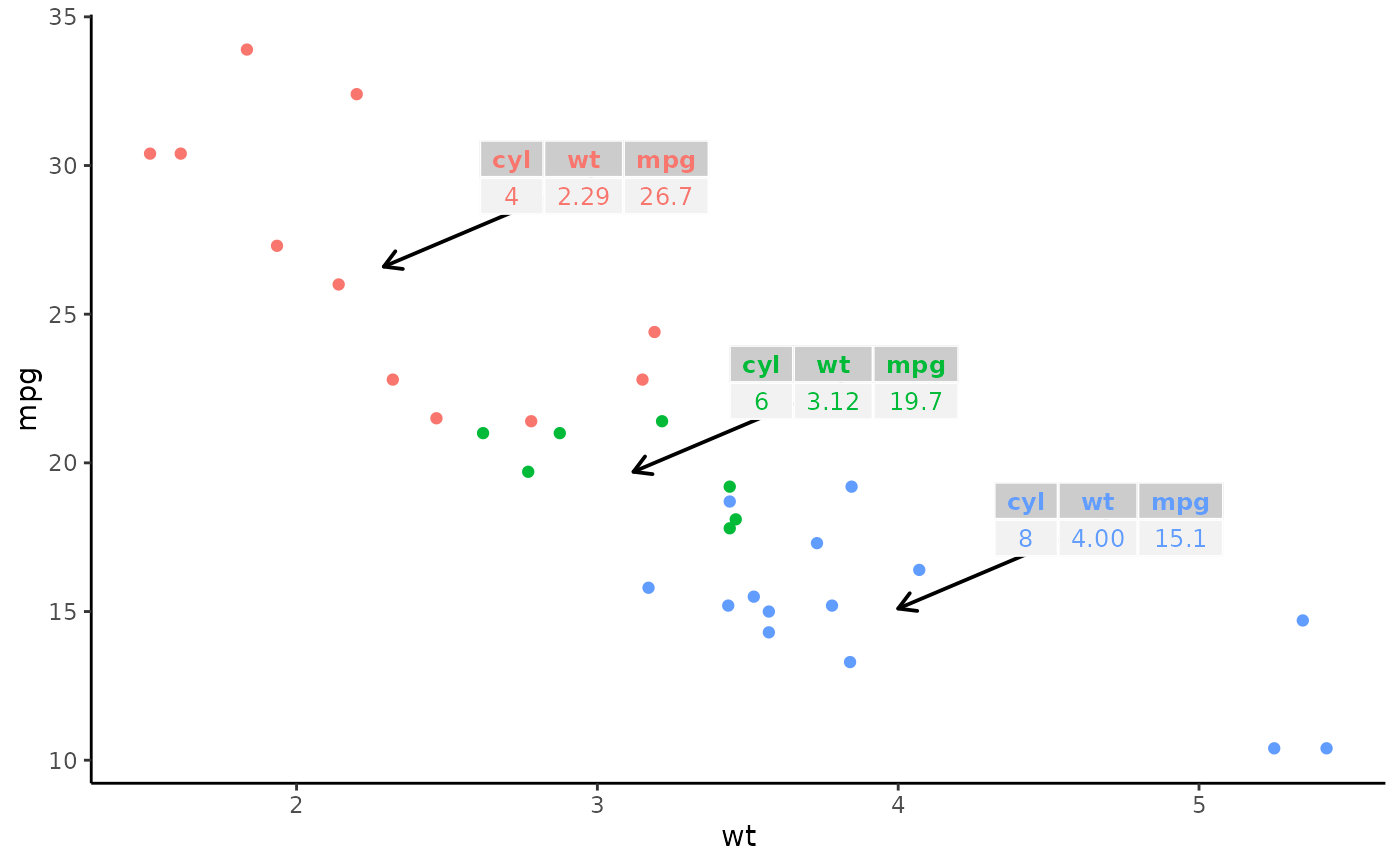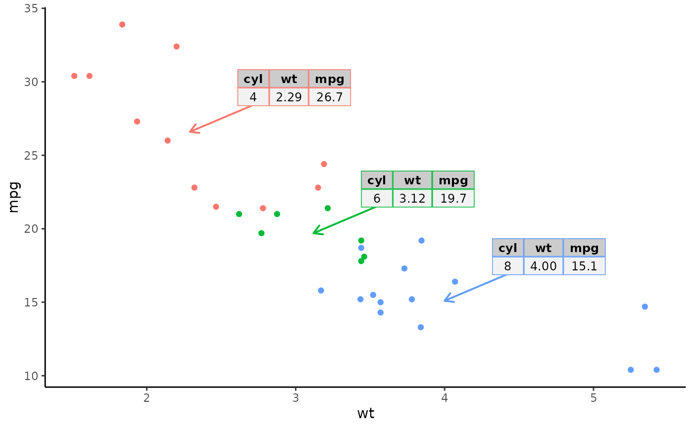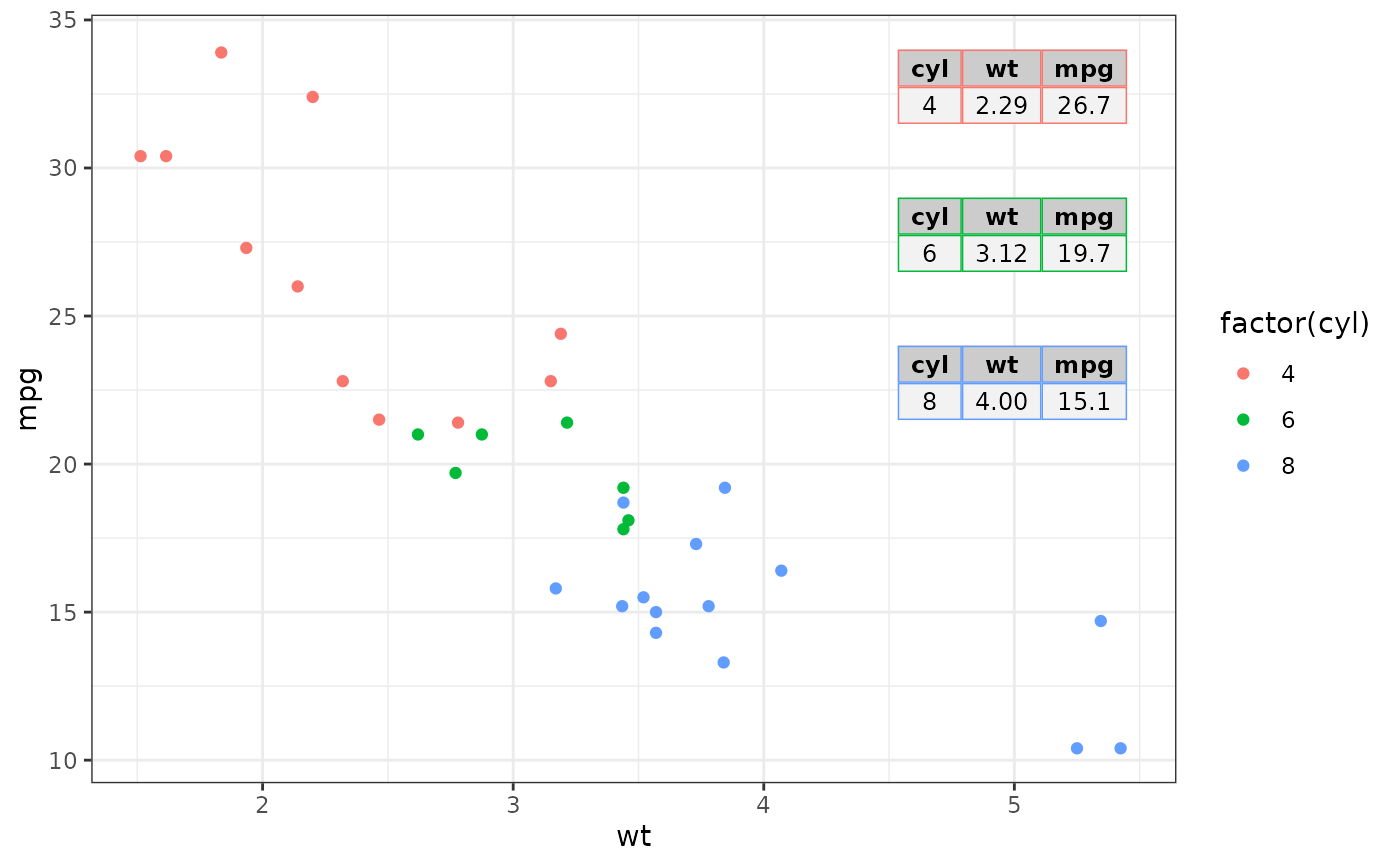 ggplot(mtcars, aes(wt, mpg, colour = factor(cyl))) +