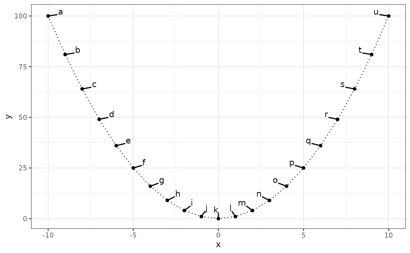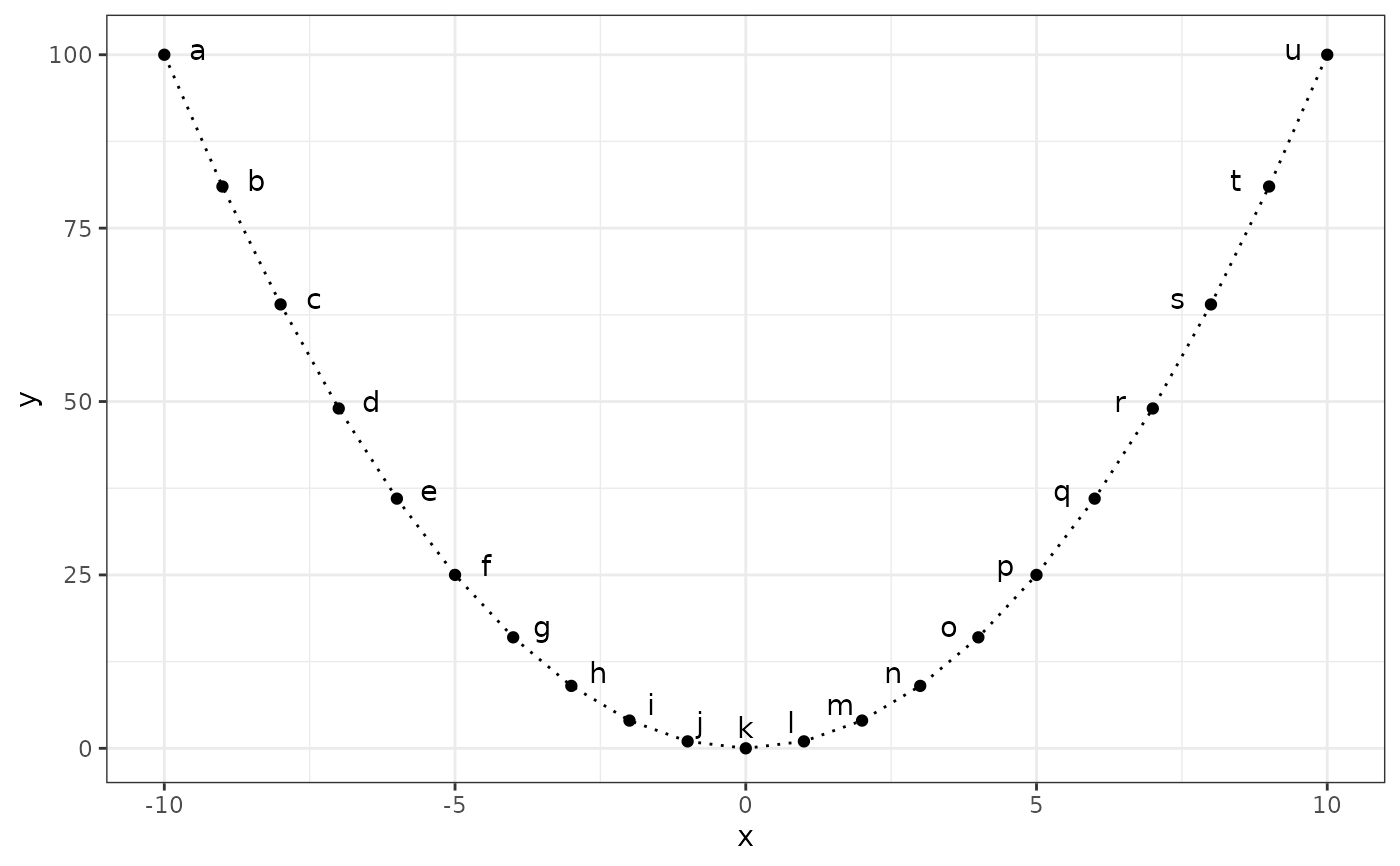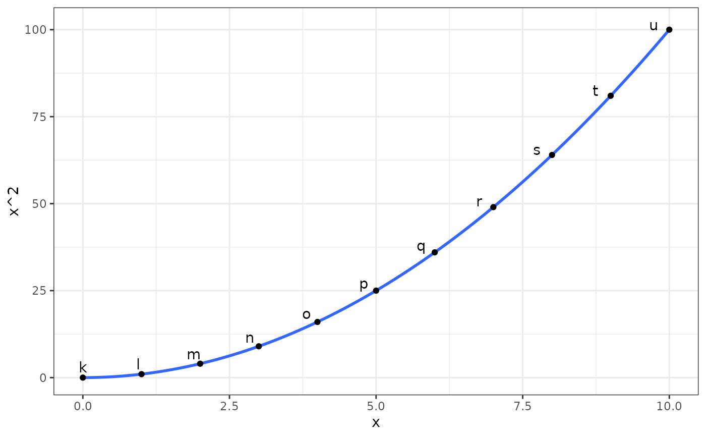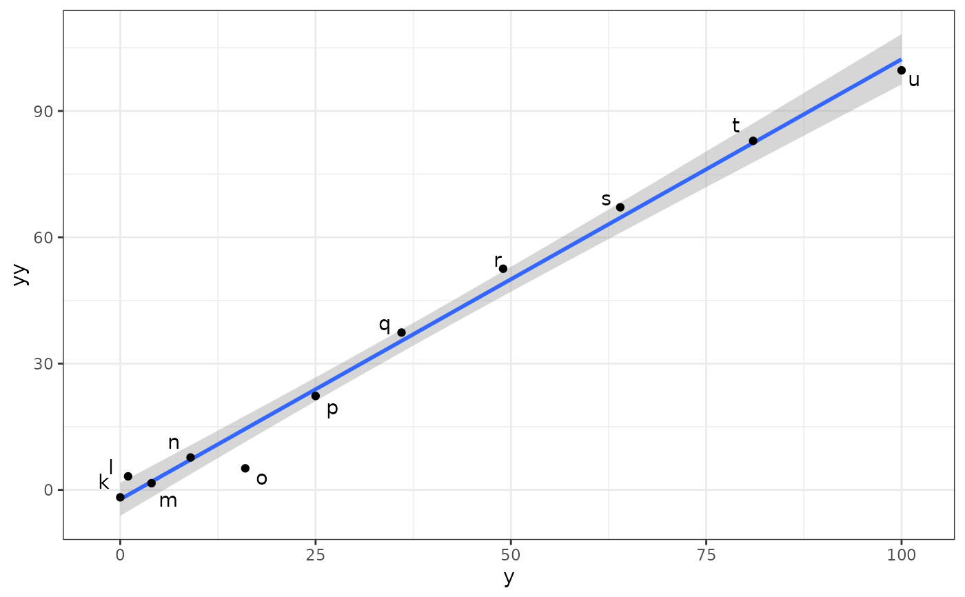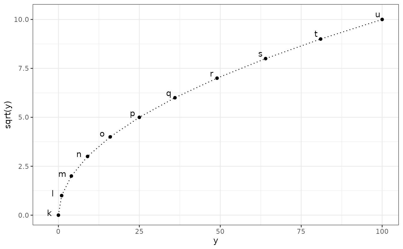 ggplot(subset(df, x >= 0), aes(y, sqrt(y), label = l)) +