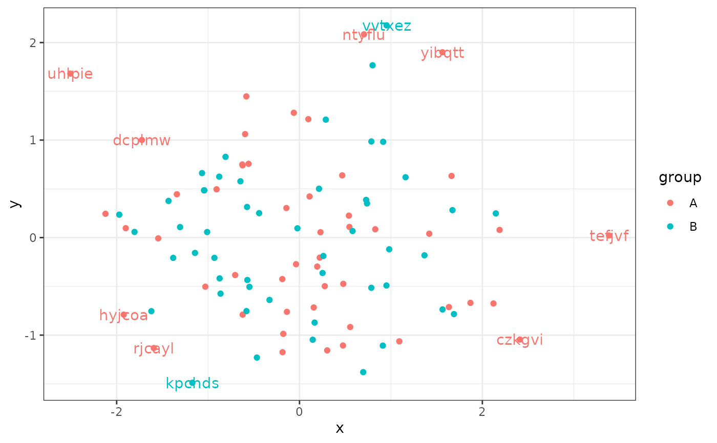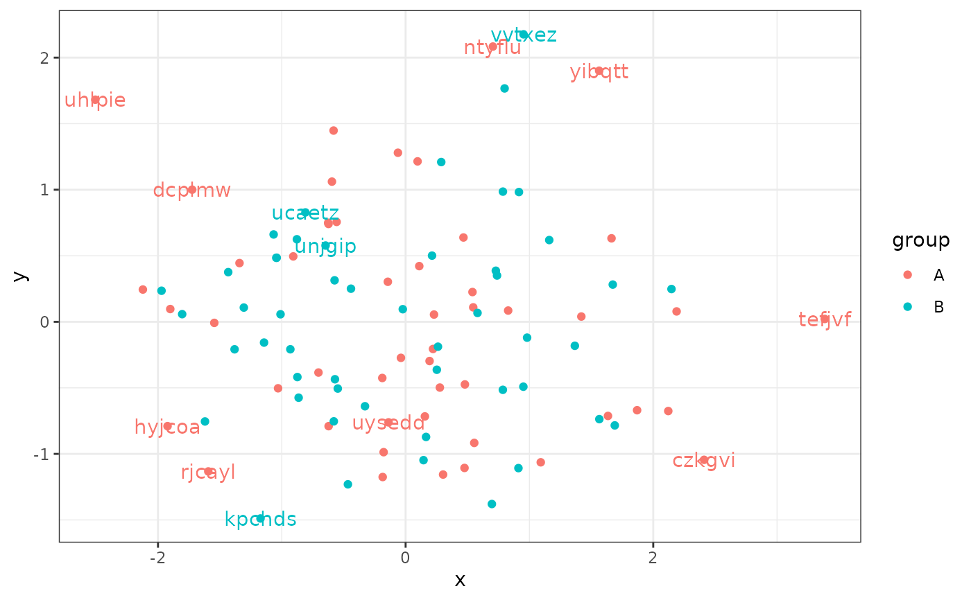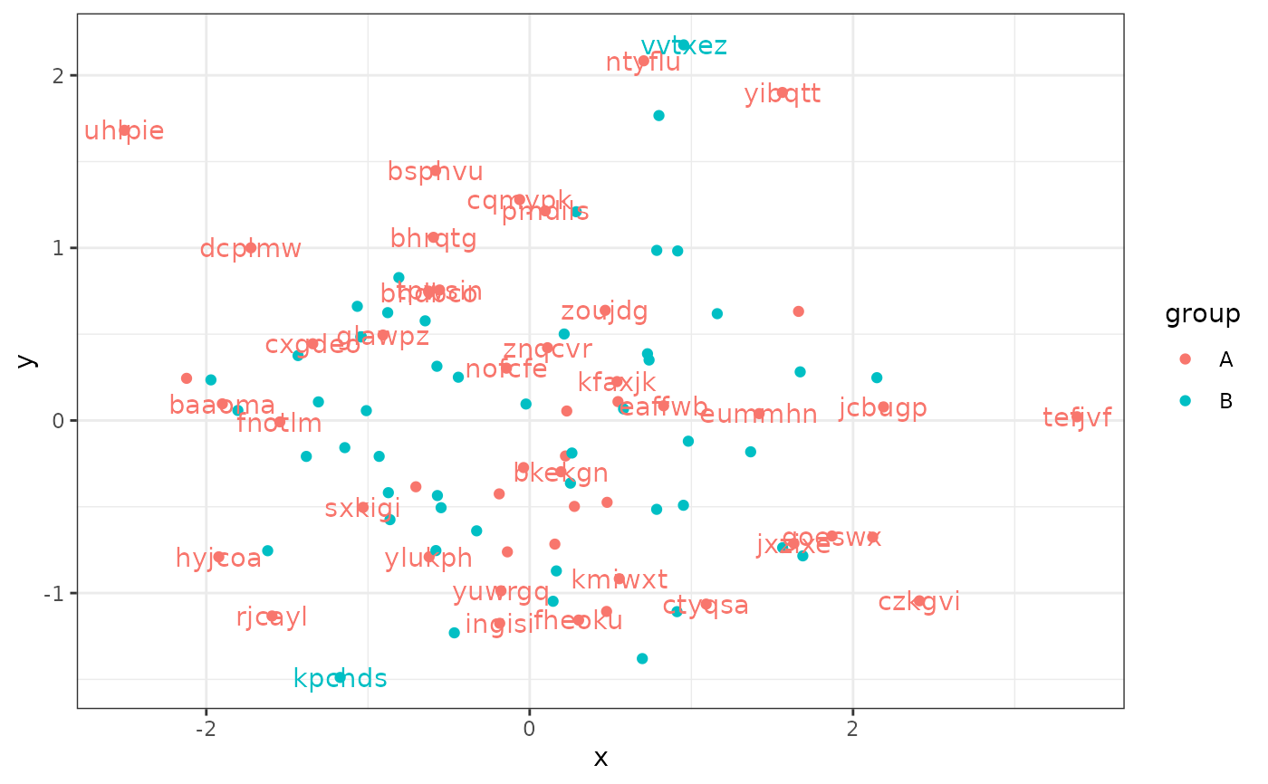 ggplot(data = d, aes(x, y, label = lab, colour = group)) +