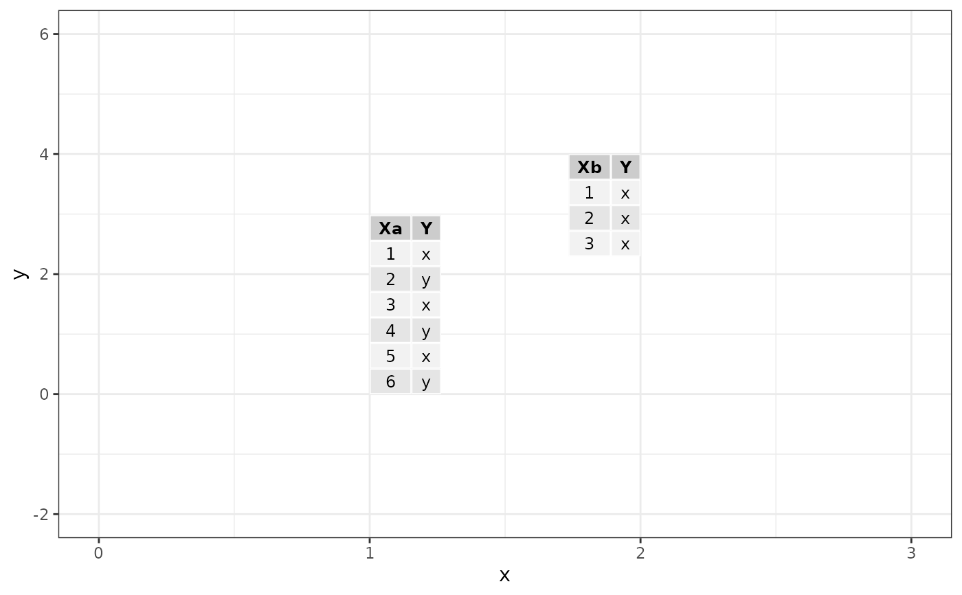 tbs = list(a = tibble::tibble(Xa = 1:6, Y = rep(c("x", "y"), 3)),