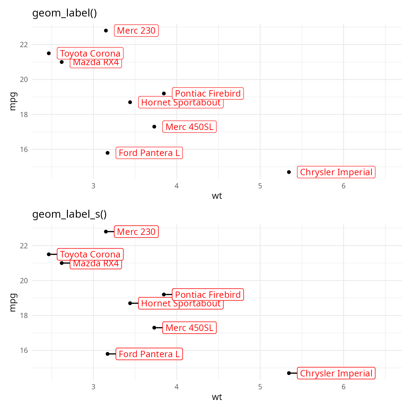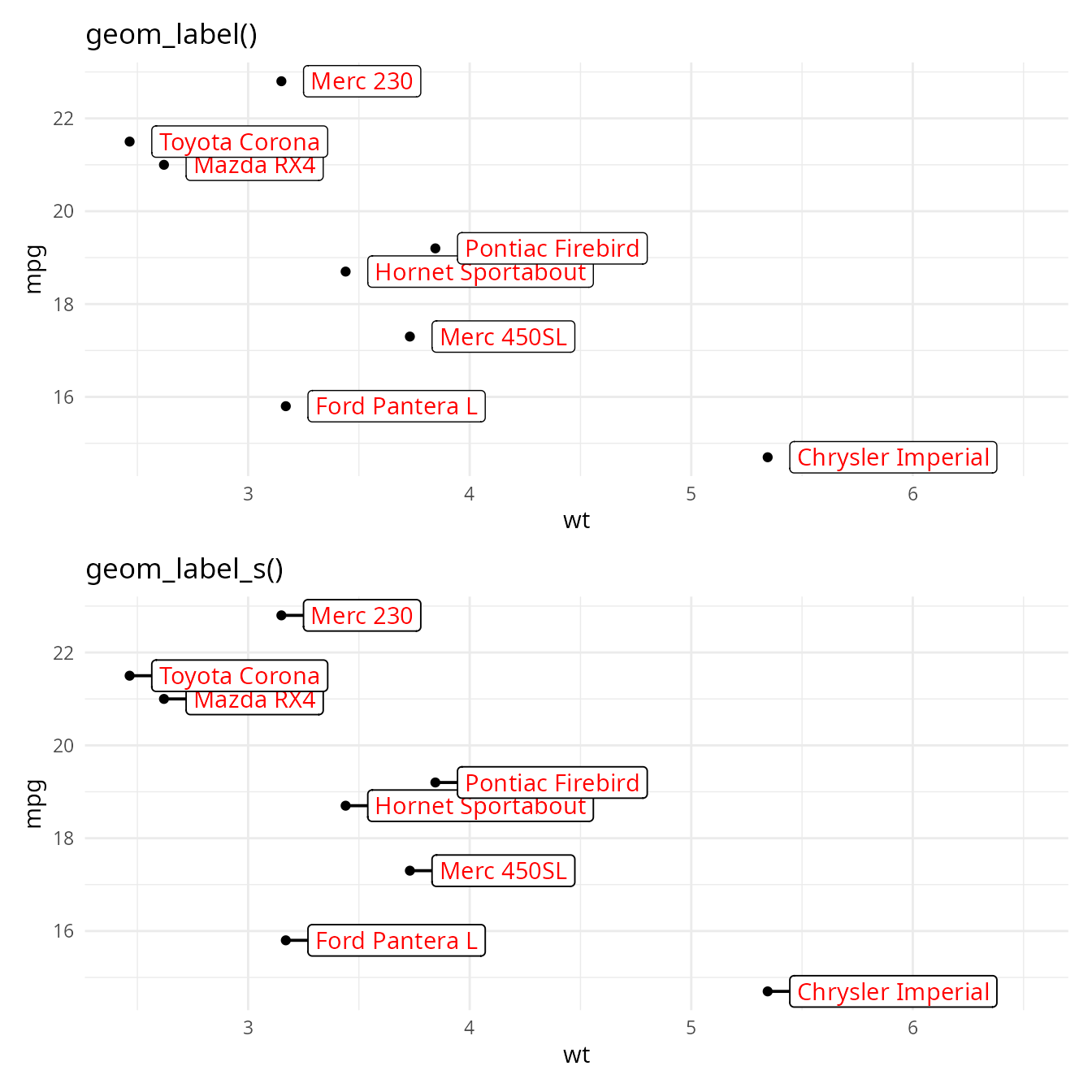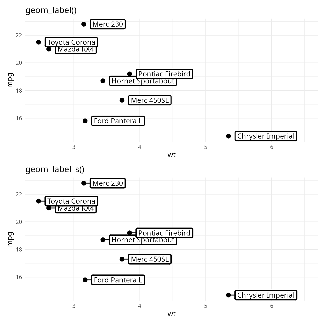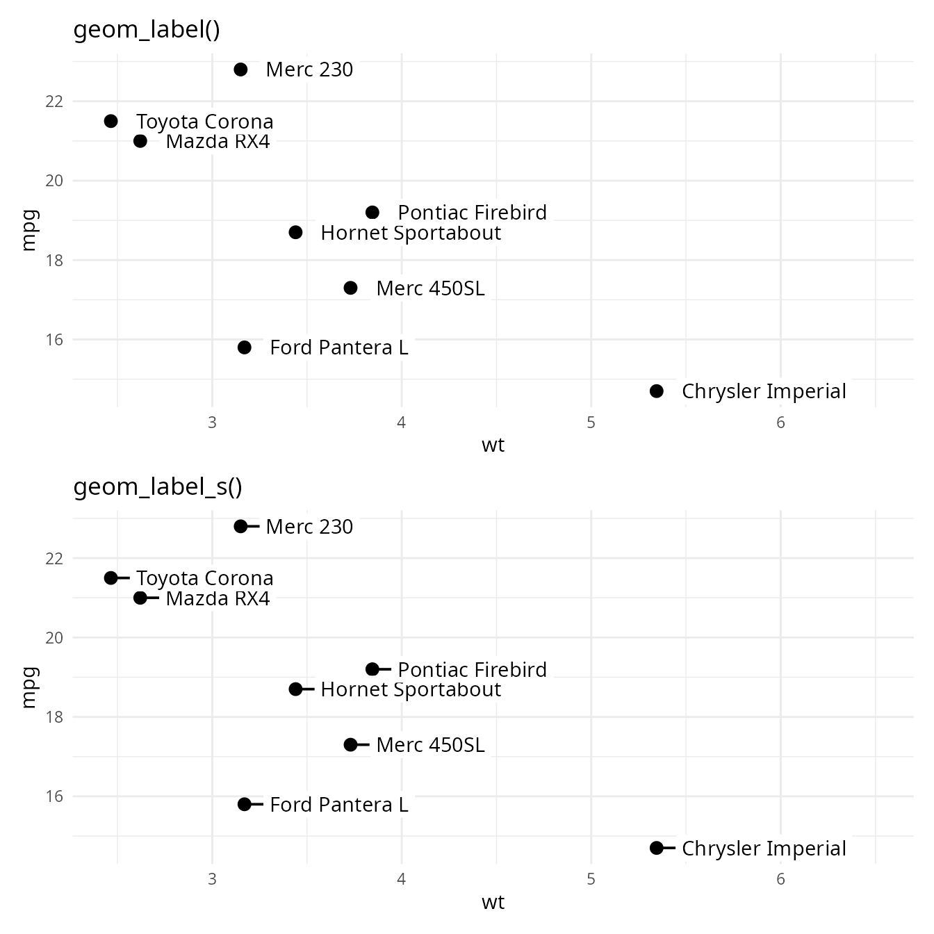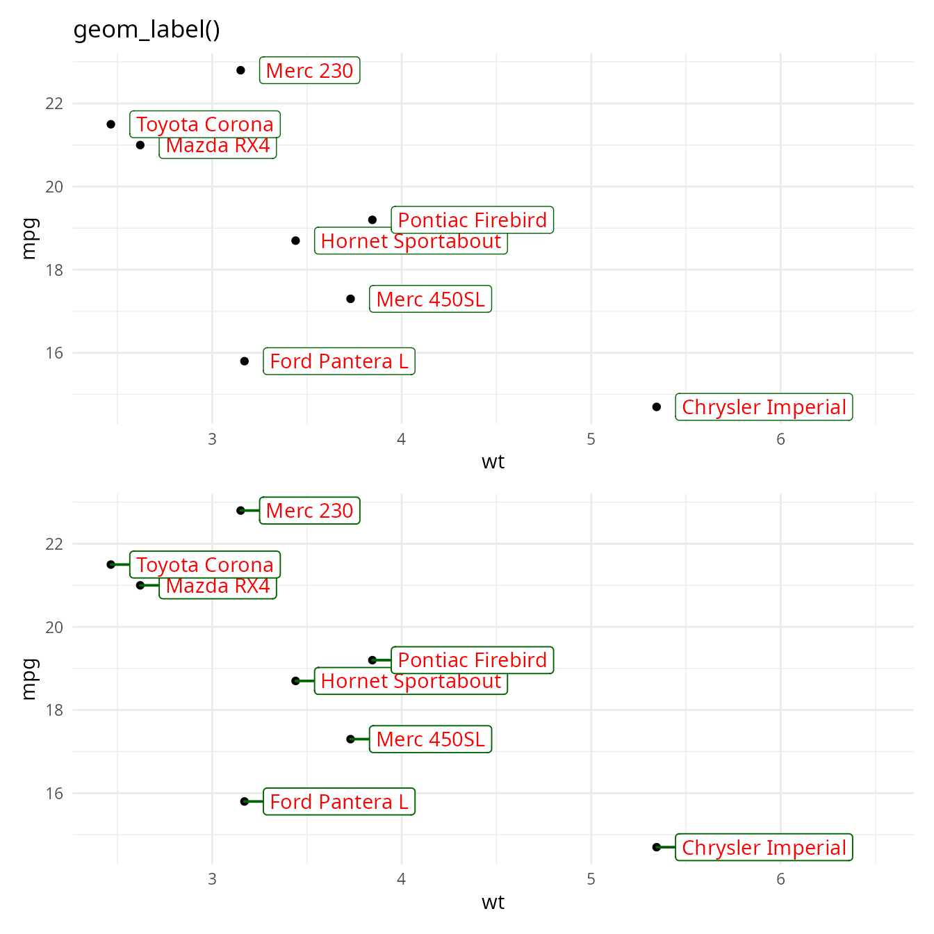 (p + geom_label(nudge_x = 0.1, hjust = 0) + labs(title = "geom_label()")) /