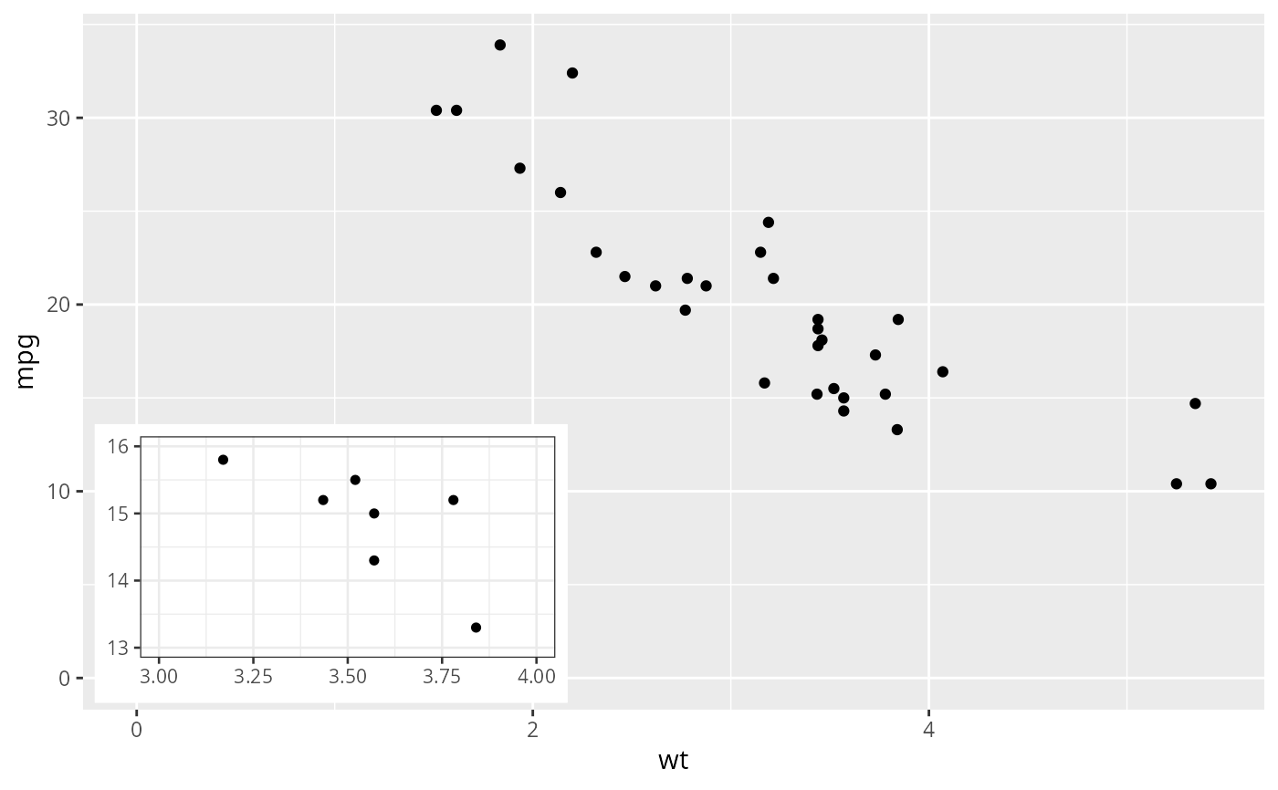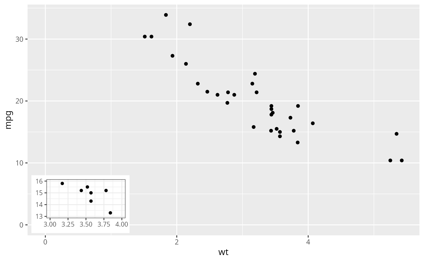 The "width" and "height" of an inset as for a text element are 0, so stacking and dodging inset plots will not work by default, and axis limits are not automatically expanded to include all inset plots. Obviously, insets do have height and width, but they are physical units, not data units. The amount of space they occupy on the main plot is not constant in data units of the base plot: when you modify scale limits, inset plots stay the same size relative to the physical size of the base plot.