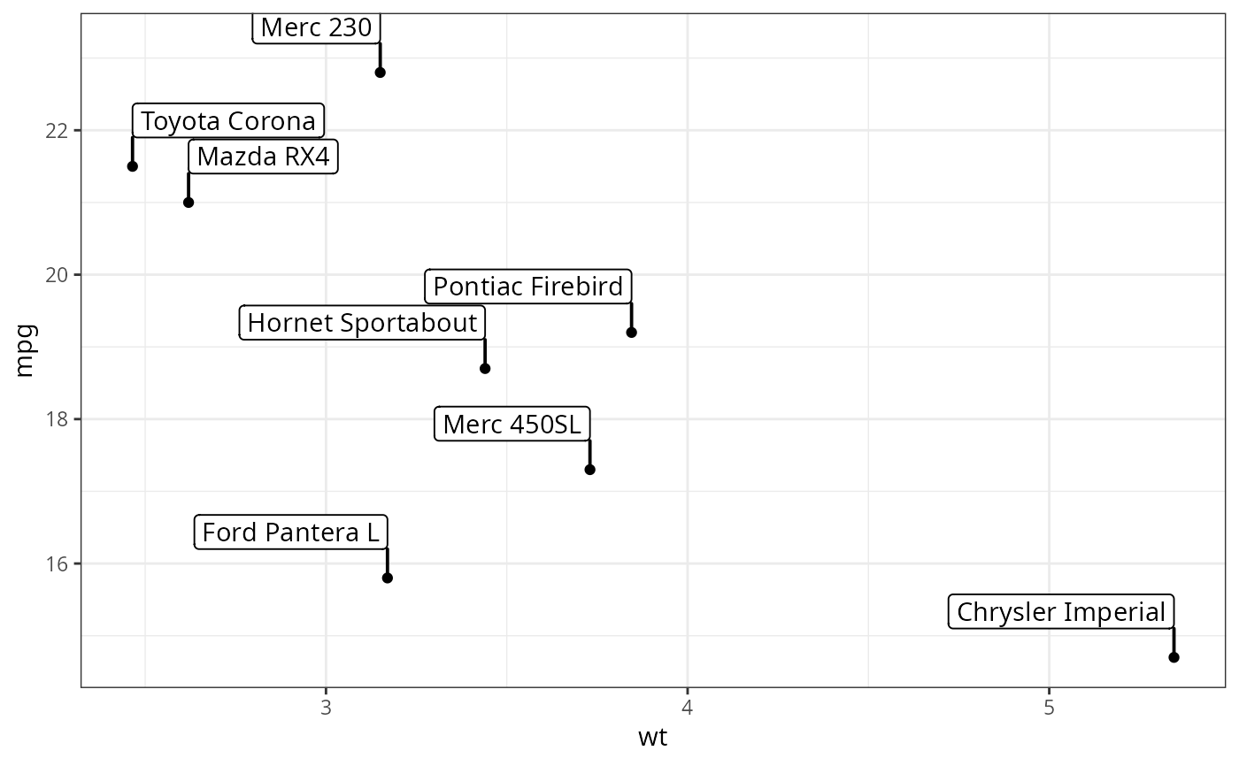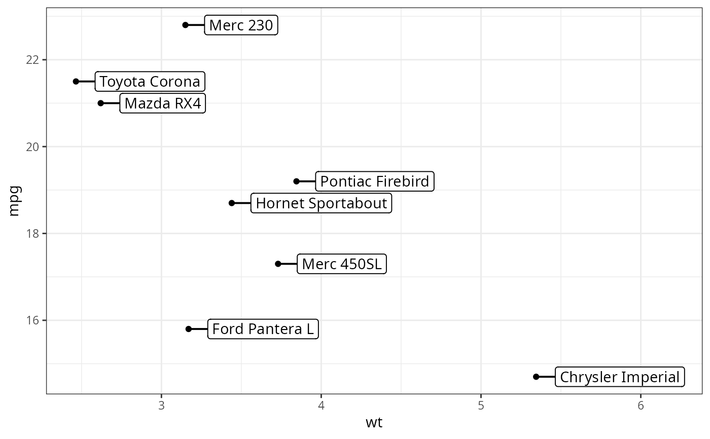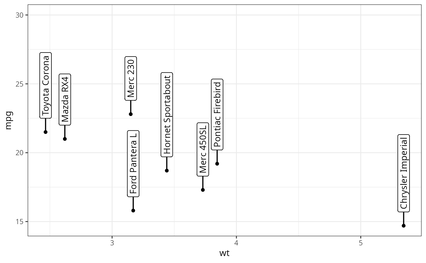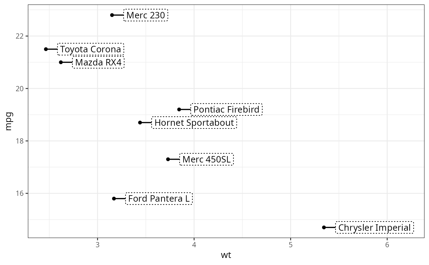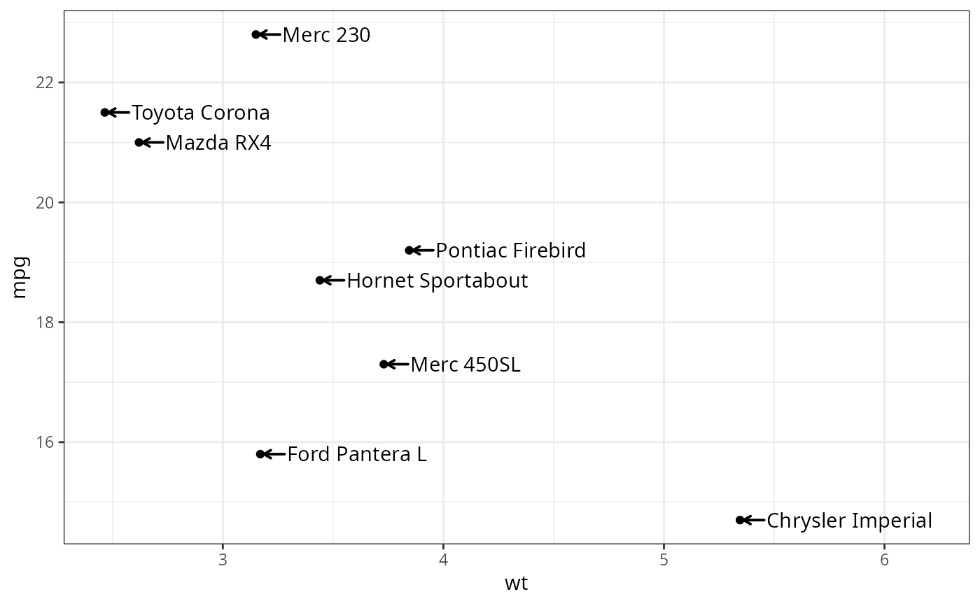Linked text geometries are most useful for adding data labels to plots. `geom_text_s()` and `geom_label_s()` add text to the plot and for nudged positions link the original location to the nudged text with a segment or arrow.