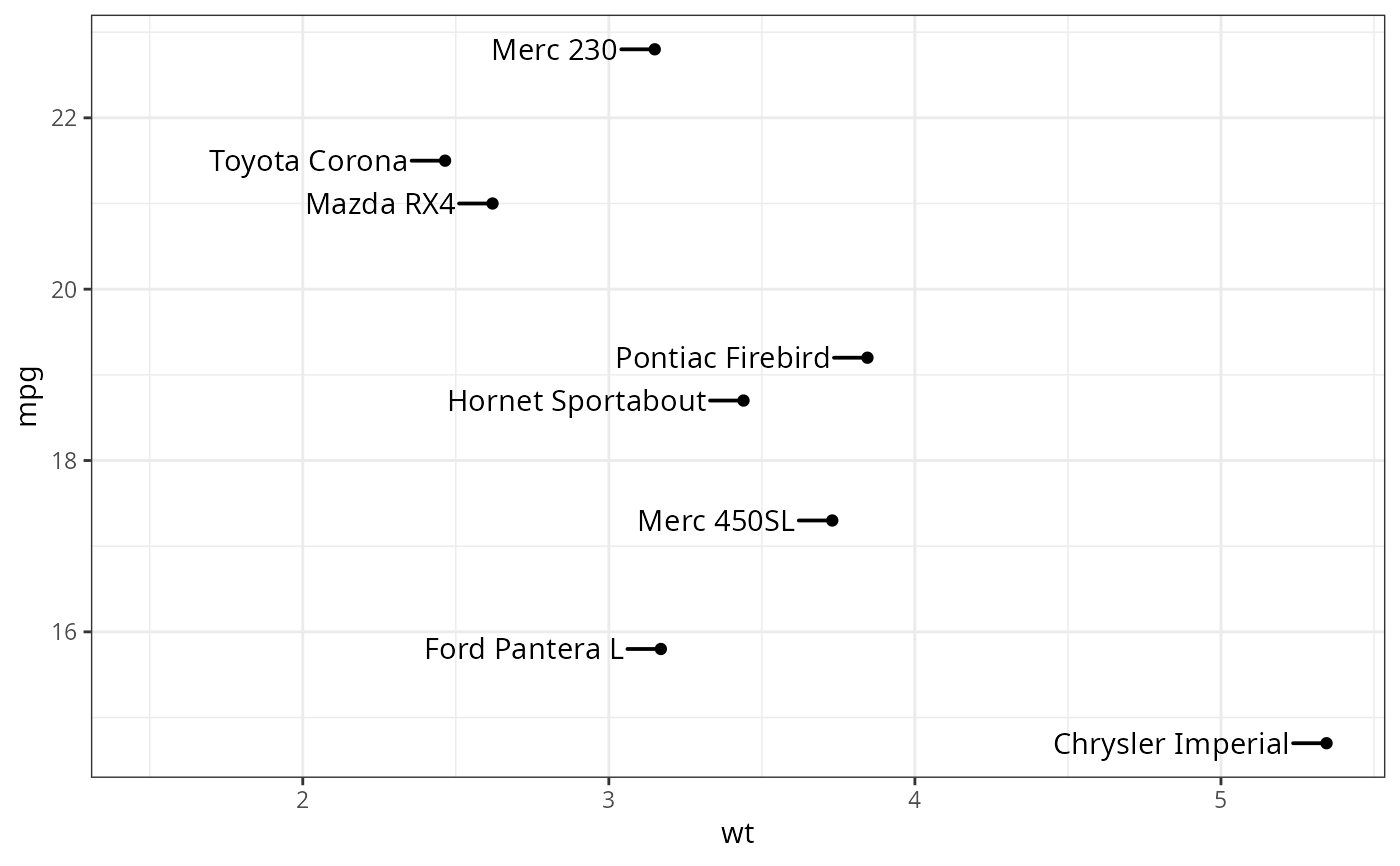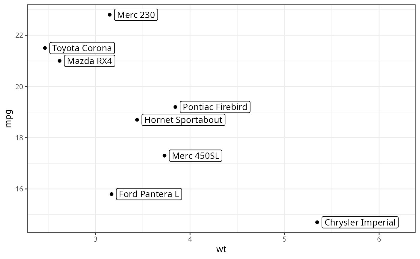p <- ggplot(my.cars, aes(wt, mpg, label = name)) +