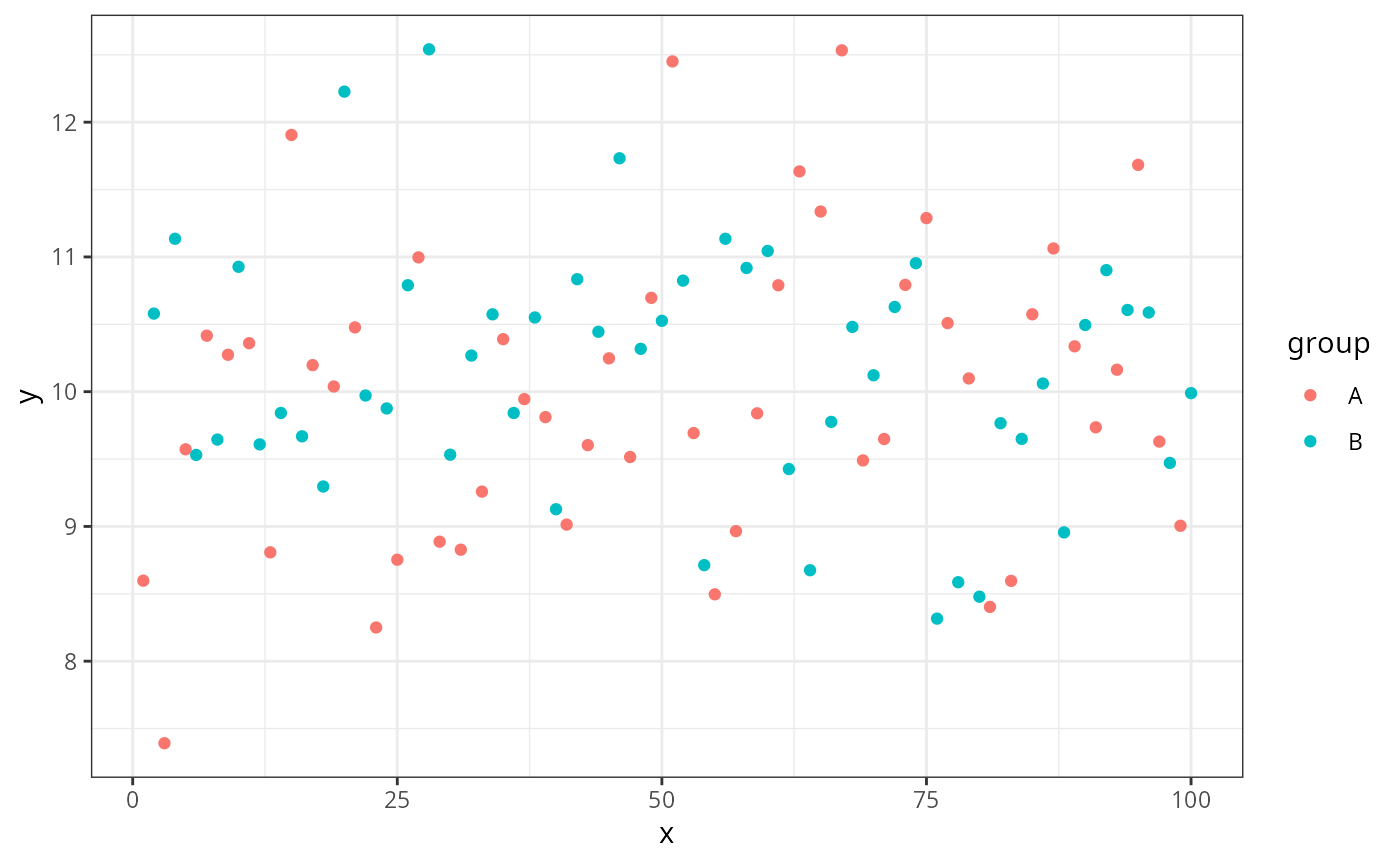 group <- factor(rep(c("A", "B"), times = 50))