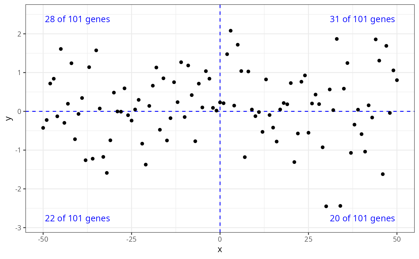 stat_quadrant_counts(aes(label = sprintf("%i of %i genes",