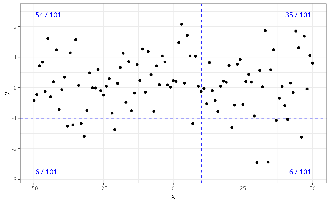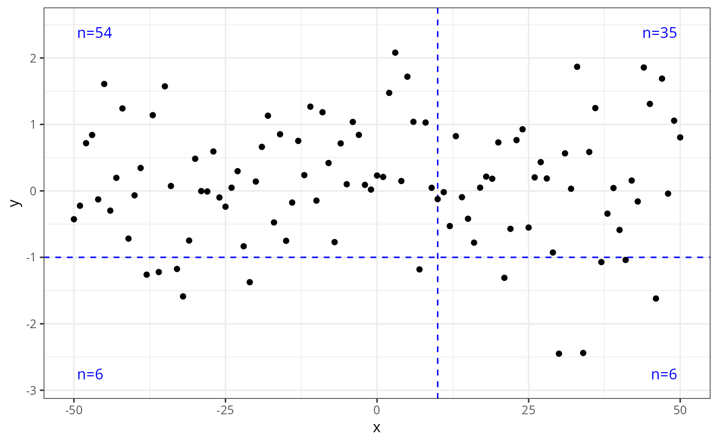 stat_quadrant_counts(colour = "blue", xintercept = 10, yintercept = -1) +