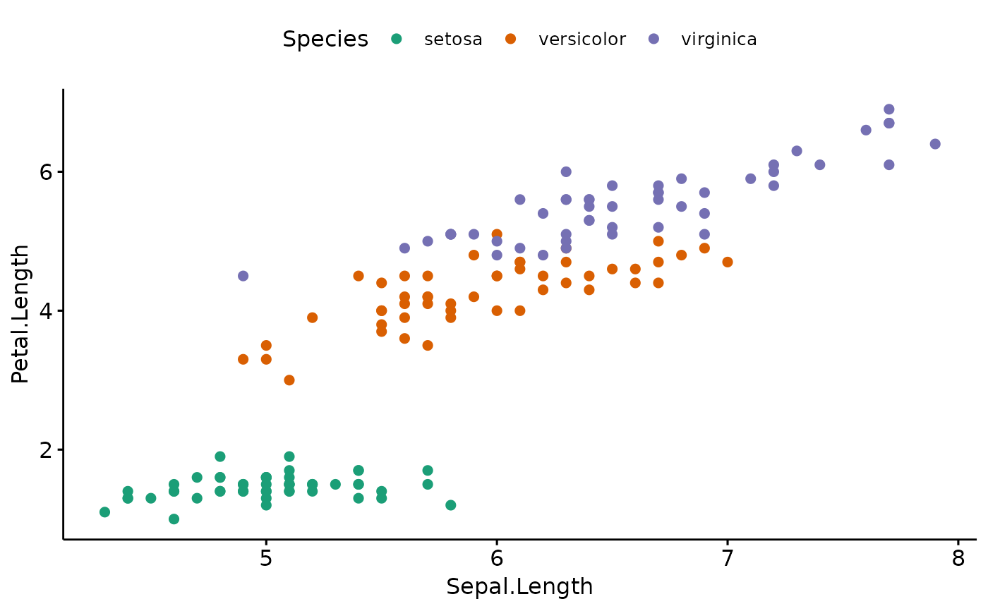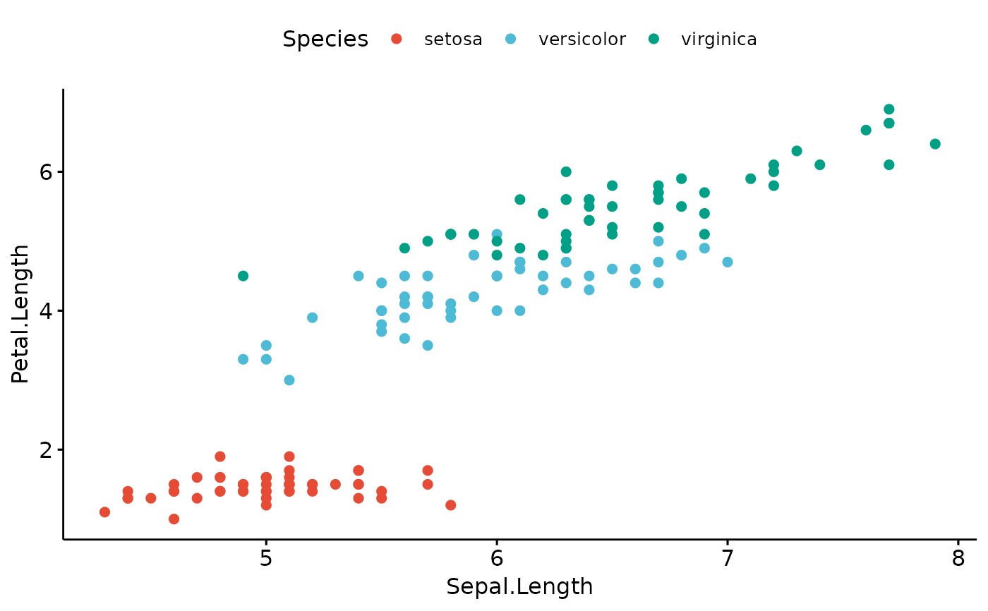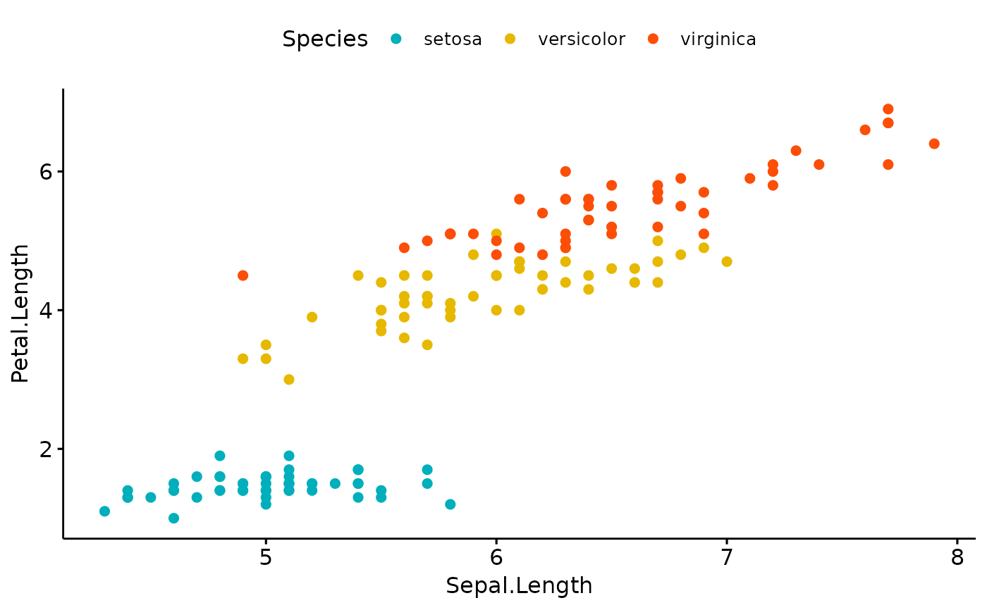 ggscatter(iris, x = "Sepal.Length", y = "Petal.Length",