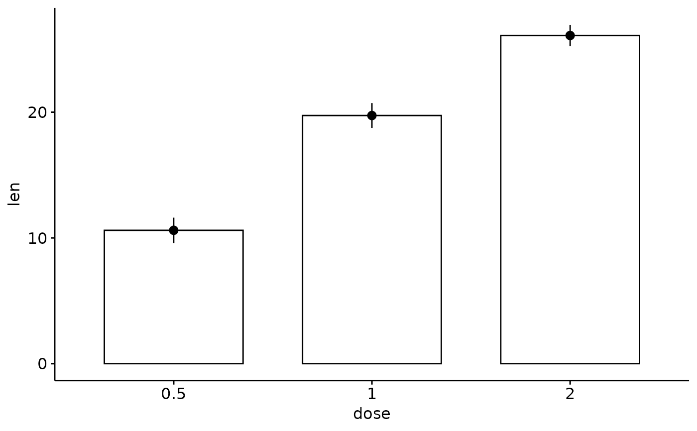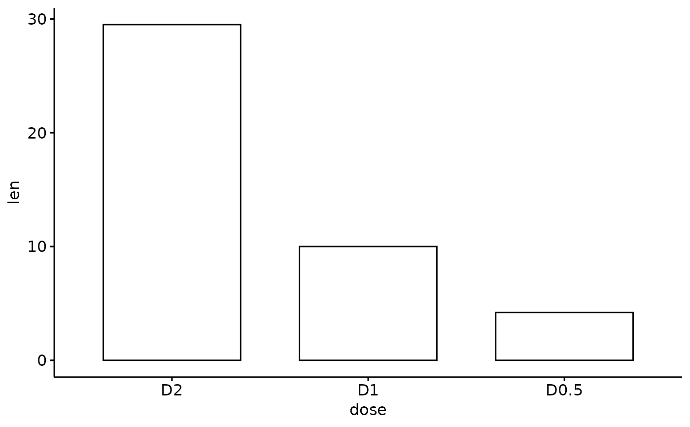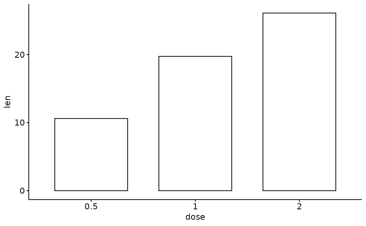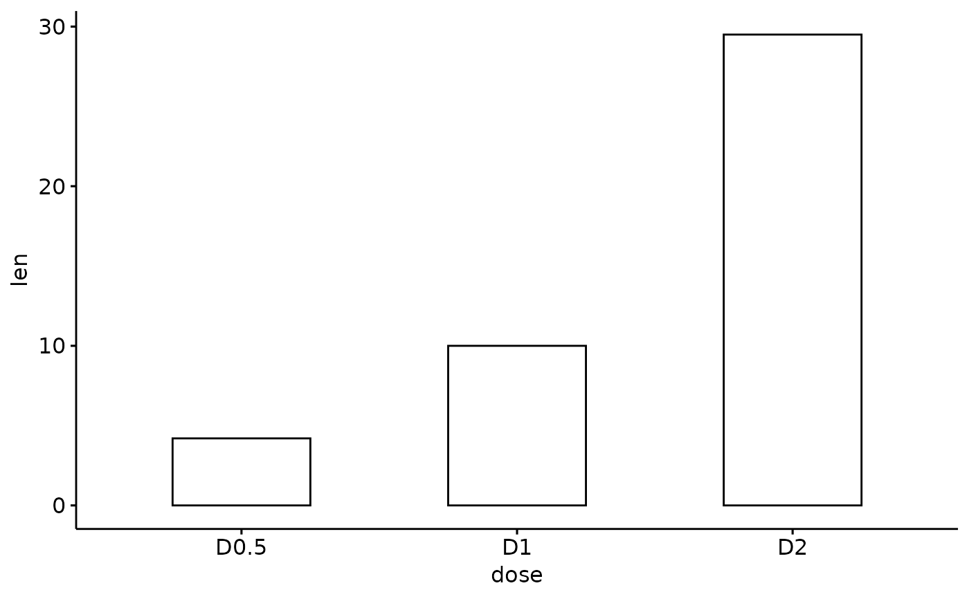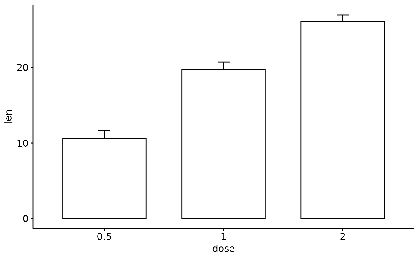 ggbarplot(df, x = "dose", y = "len", width = 0.5)
