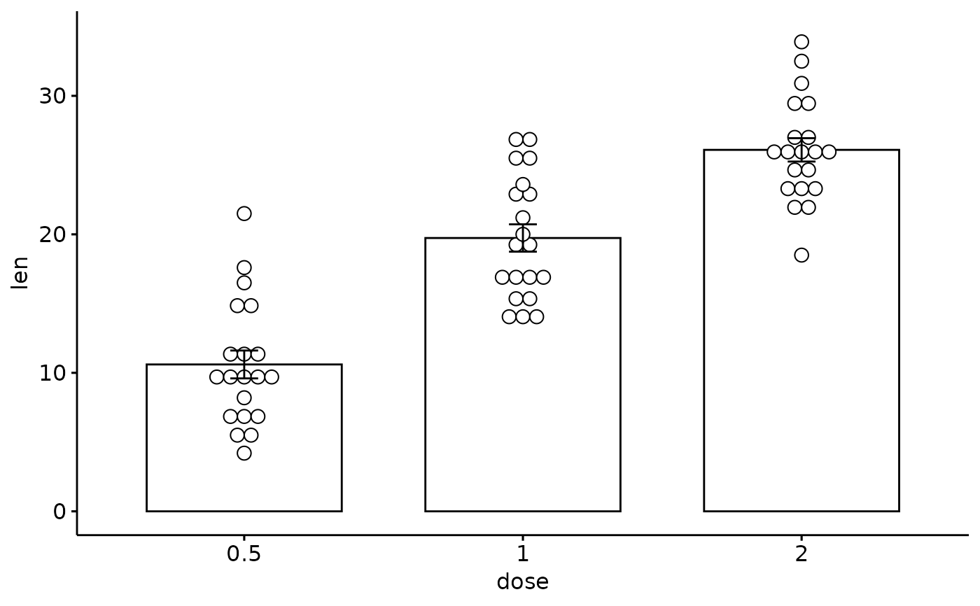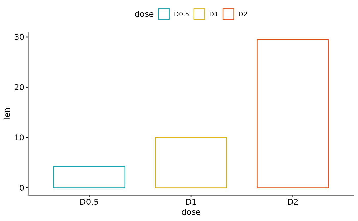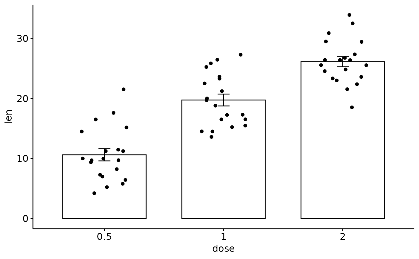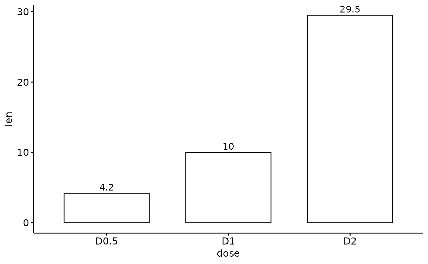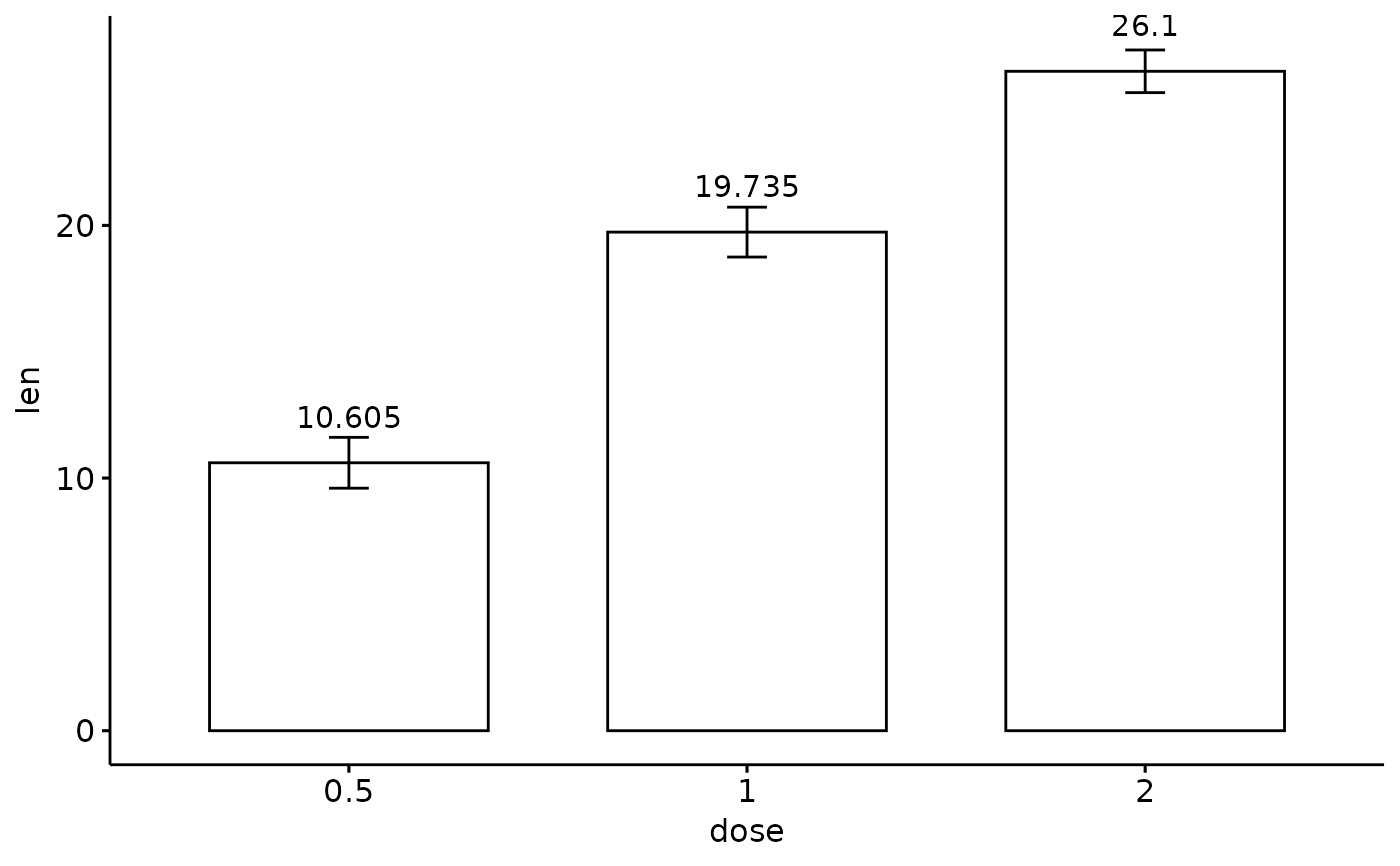ggbarplot(df, x = "dose", y = "len", width = 0.5)