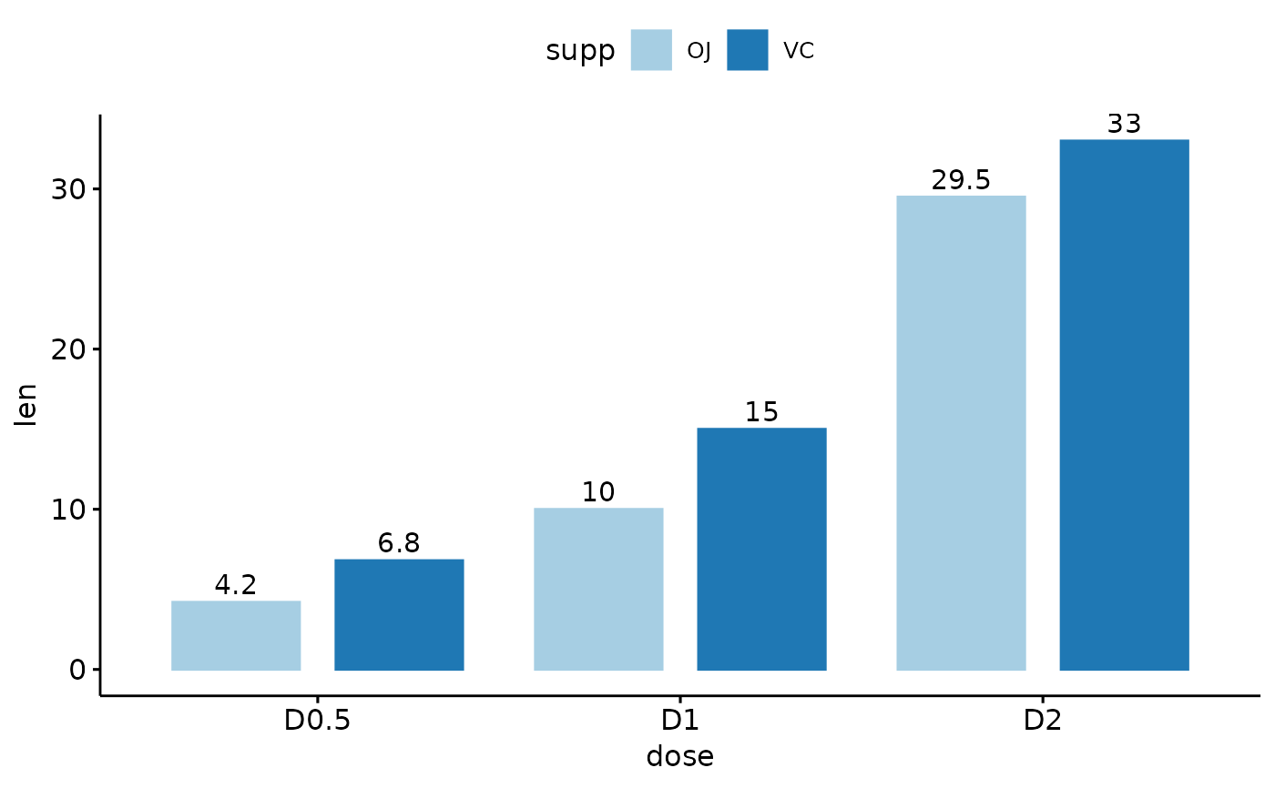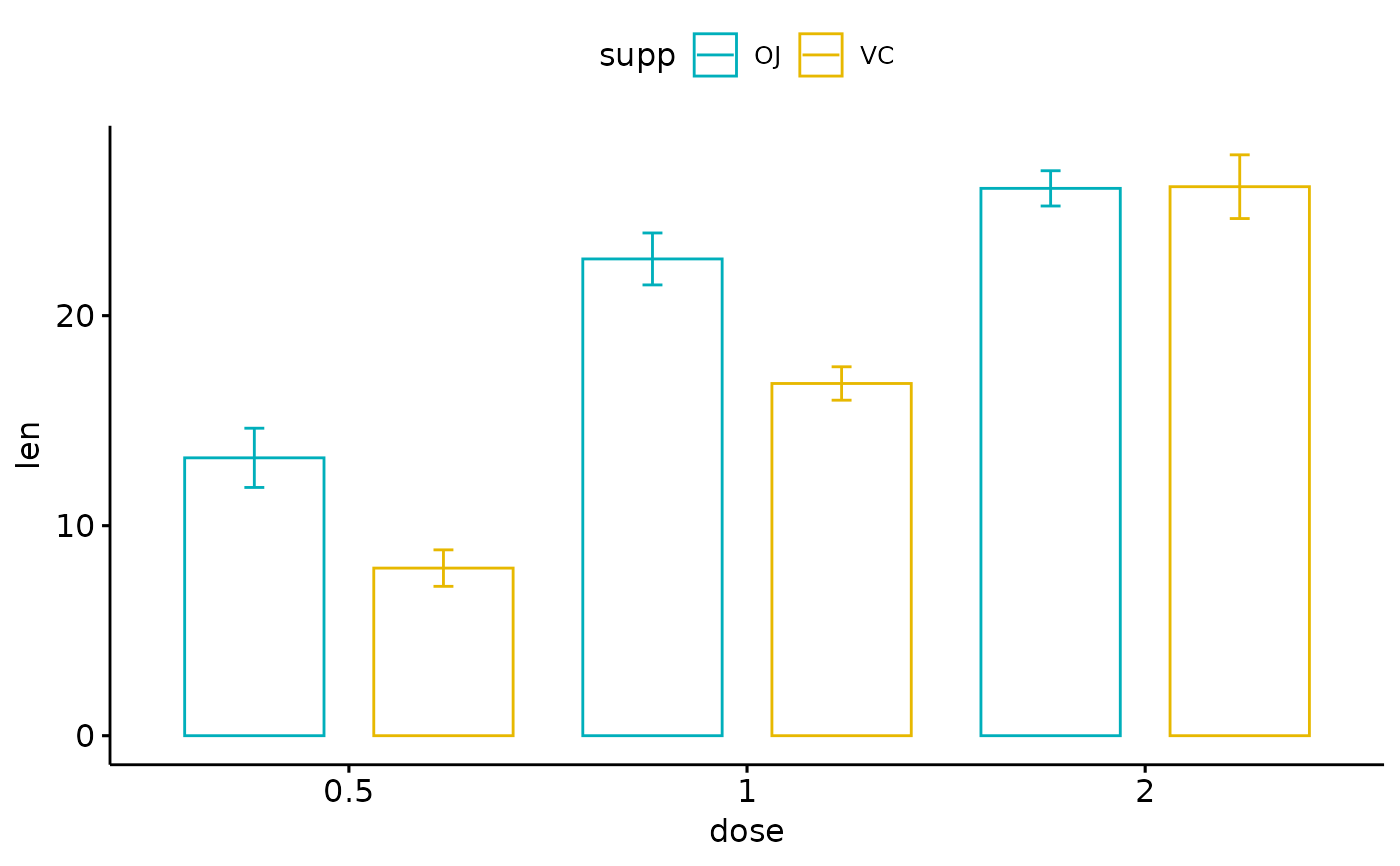 ggbarplot(df3, x = "dose", y = "len", color = "supp",