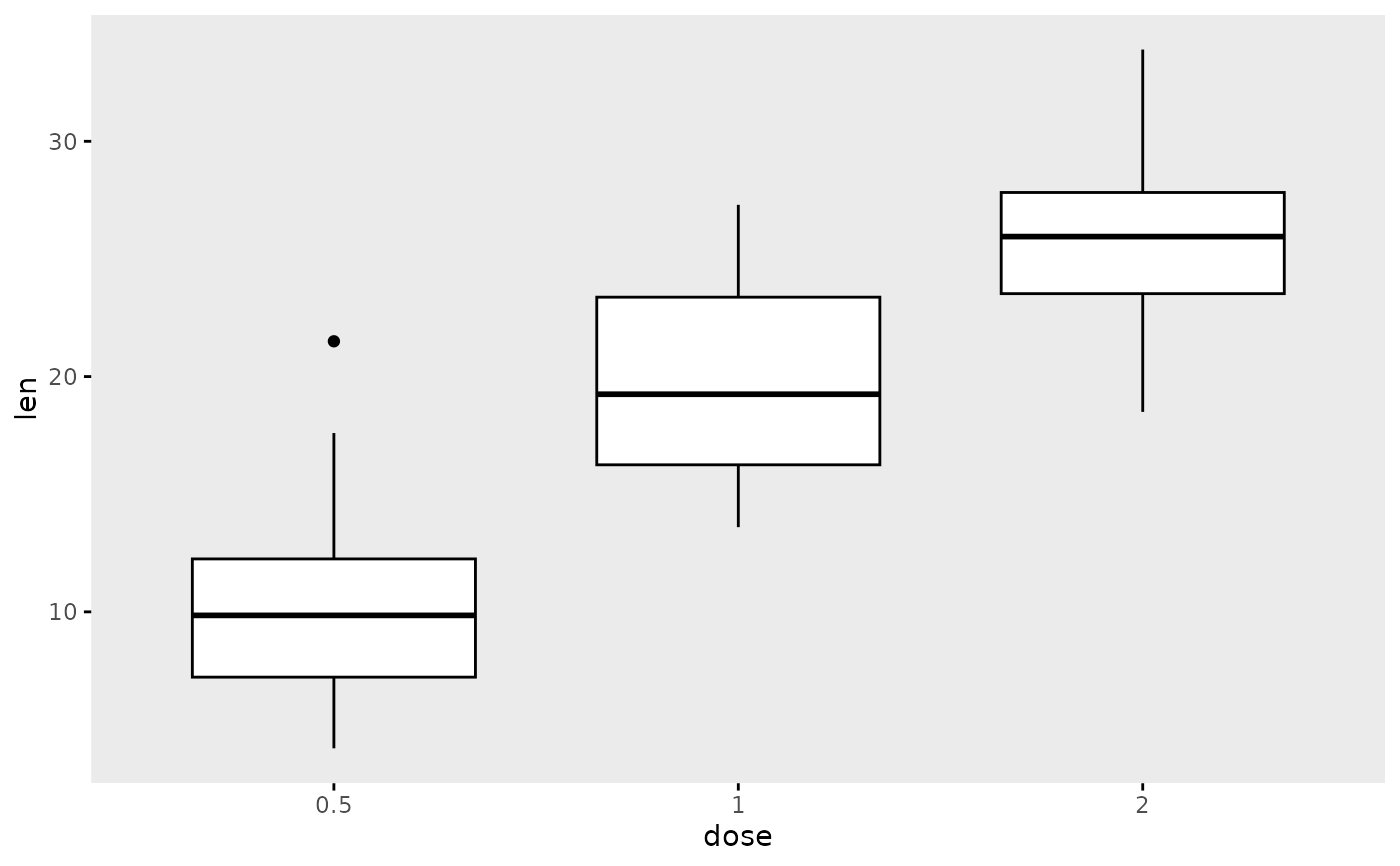 p <- ggboxplot(ToothGrowth, x = "dose", y = "len",
