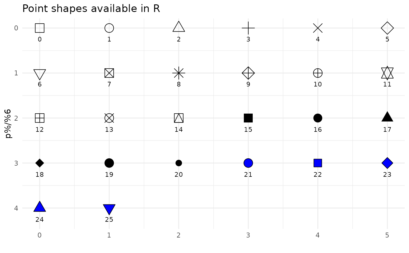 Show point shapes available in R.