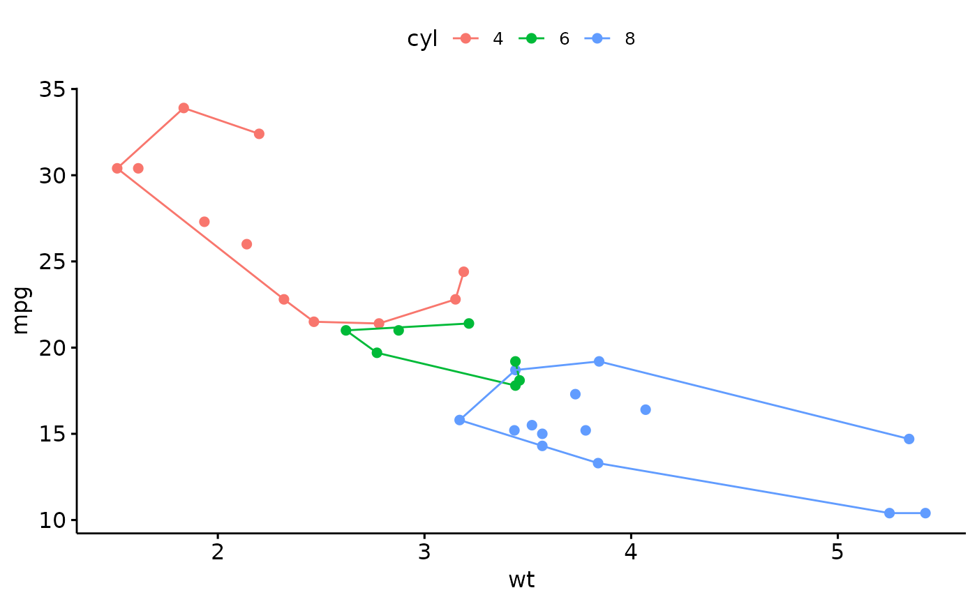stat_chull(aes(color = cyl, fill = cyl), alpha = 0.1, geom = "polygon")