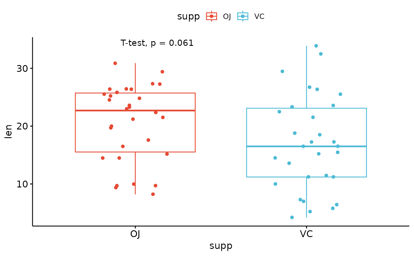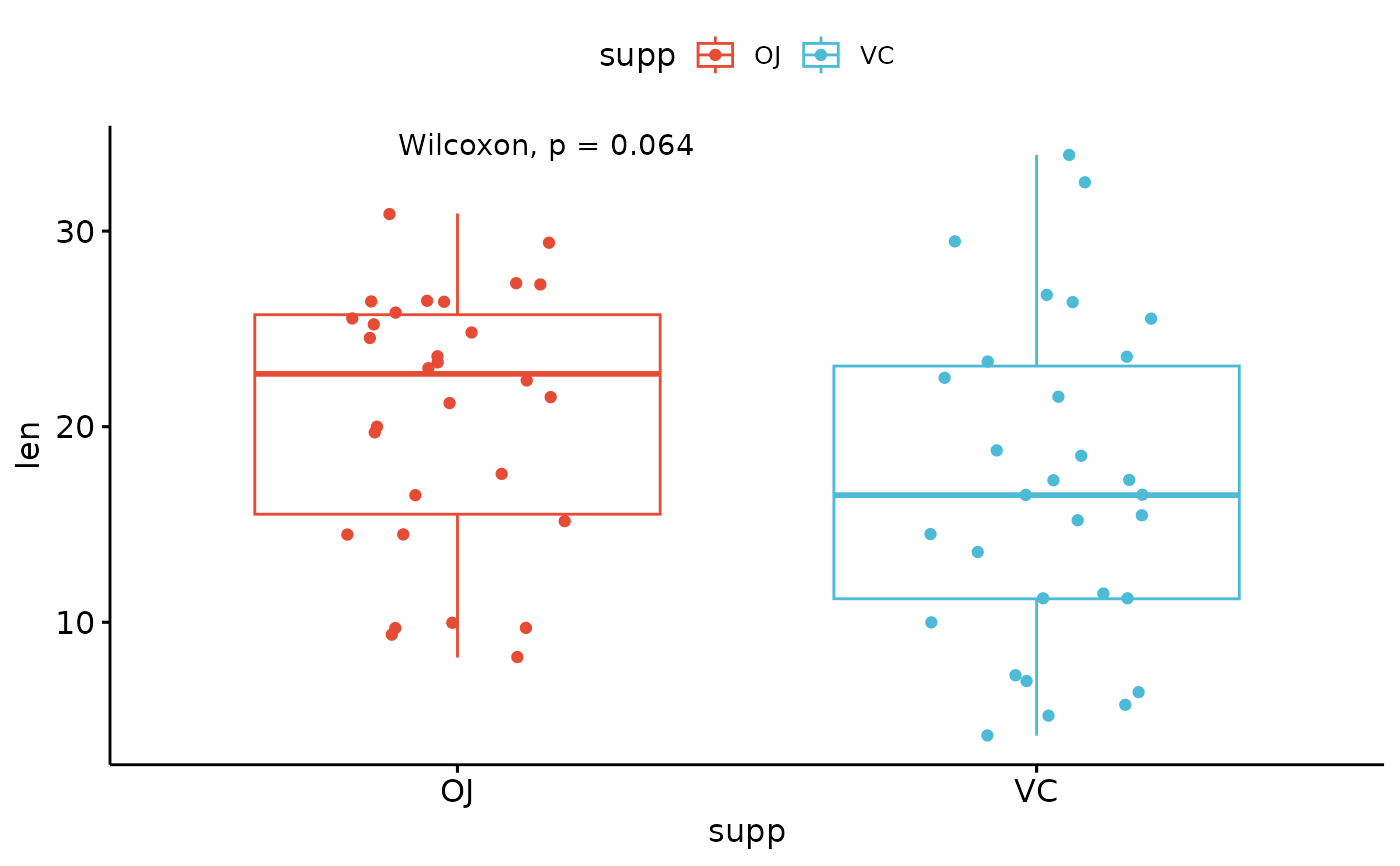p <- ggboxplot(ToothGrowth, x = "supp", y = "len",