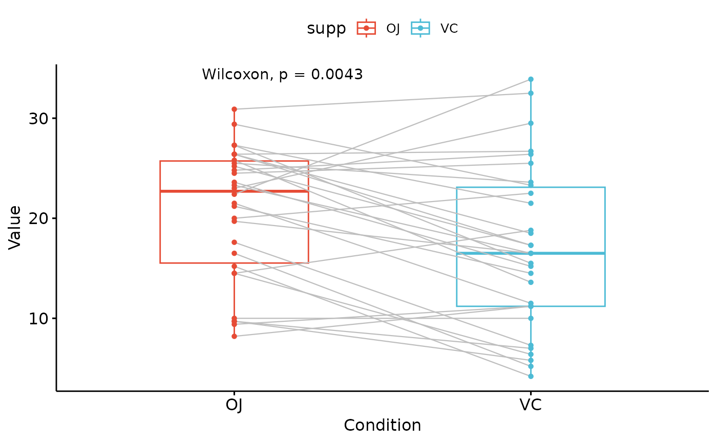 ggpaired(ToothGrowth, x = "supp", y = "len",