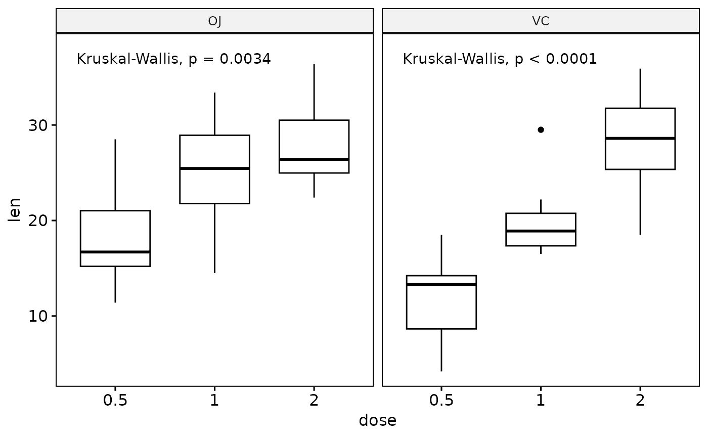 bxp2 + stat_kruskal_test(aes(group = dose), label = "p = {p.format}{p.signif}")