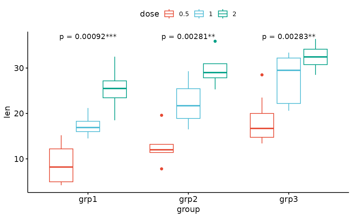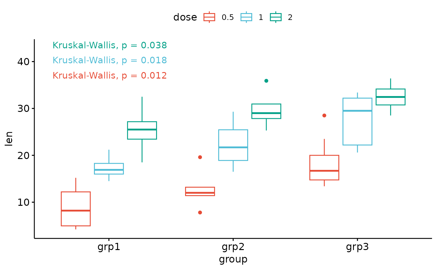 bxp2 + stat_kruskal_test(aes(group = dose, color = dose), group.by = "legend.var")