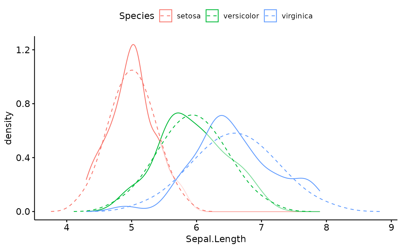 stat_overlay_normal_density(aes(color = Species), linetype = "dashed")