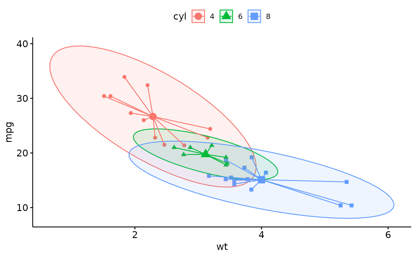 # Scatter plot with ellipses and group mean points