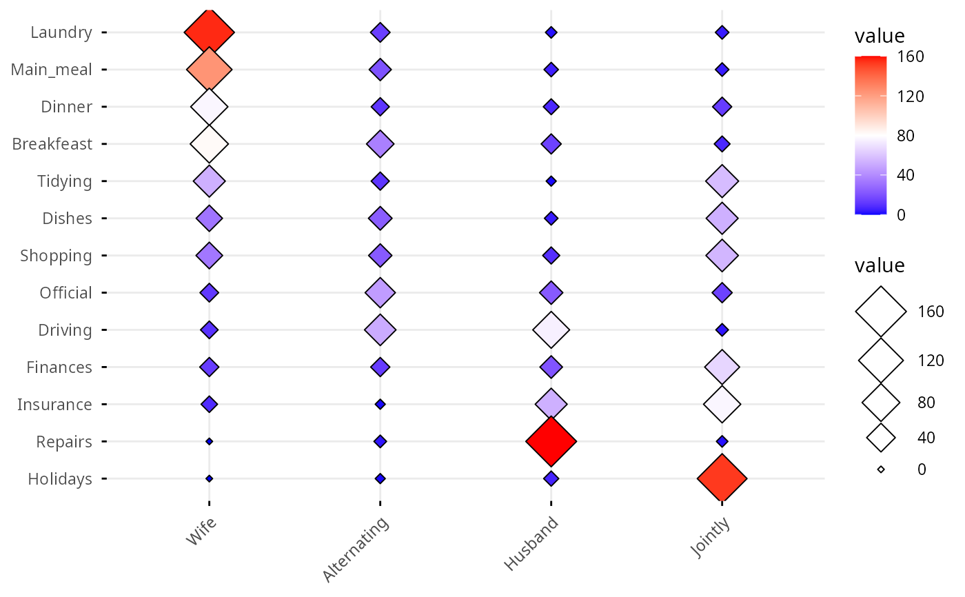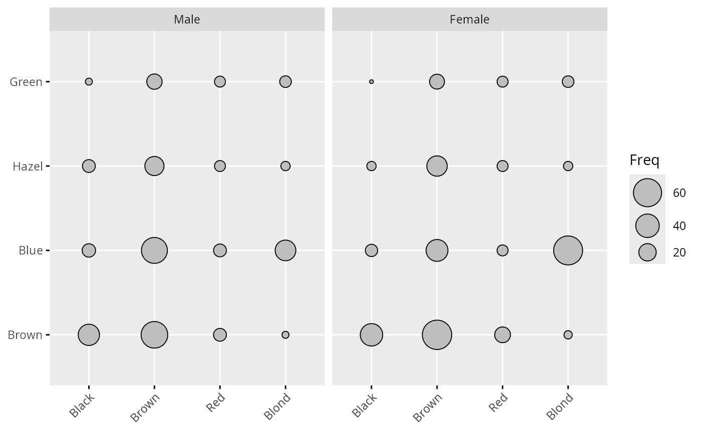 Plot a graphical matrix where each cell contains a dot whose size reflects the relative magnitude of the corresponding component. Useful to visualize contingency table formed by two categorical variables.