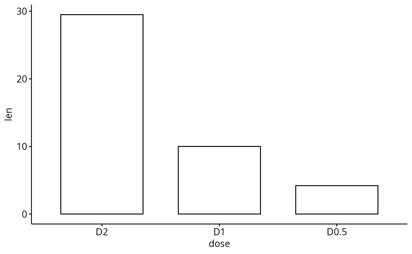 ggbarplot(df, x = "dose", y = "len", width = 0.5)