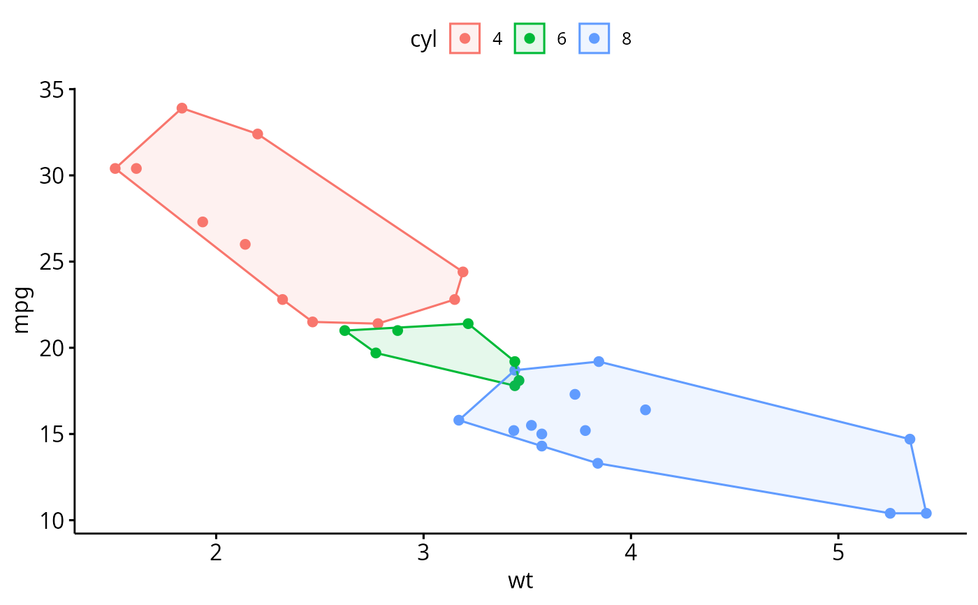 stat_chull(aes(color = cyl, fill = cyl), alpha = 0.1, geom = "polygon")