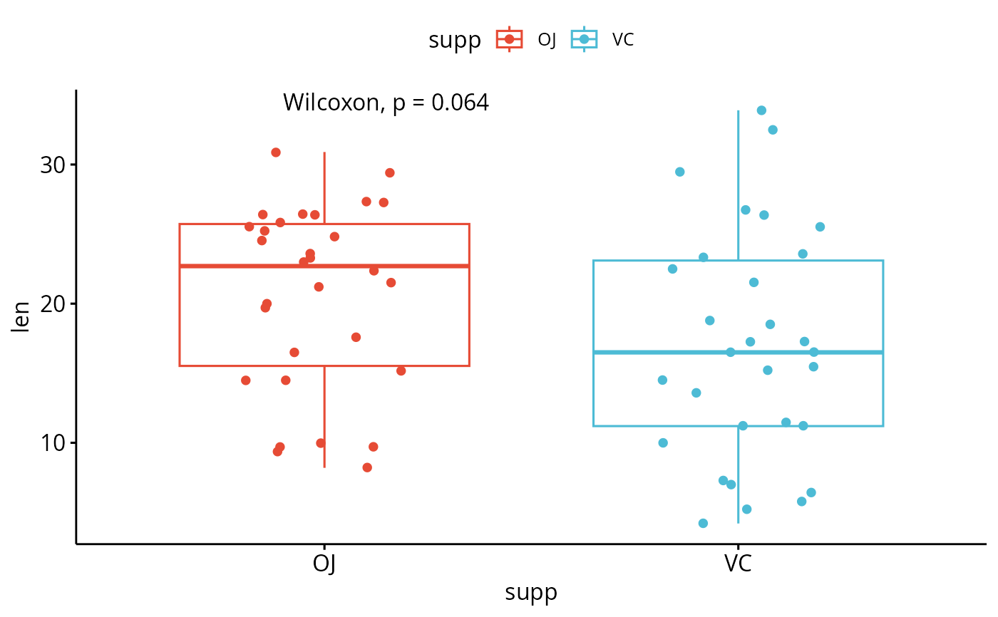p <- ggboxplot(ToothGrowth, x = "supp", y = "len",