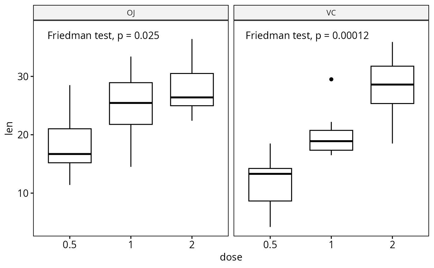 bxp + stat_friedman_test(aes(wid = id), label.x = "1", label.y = 10, hjust = 0)