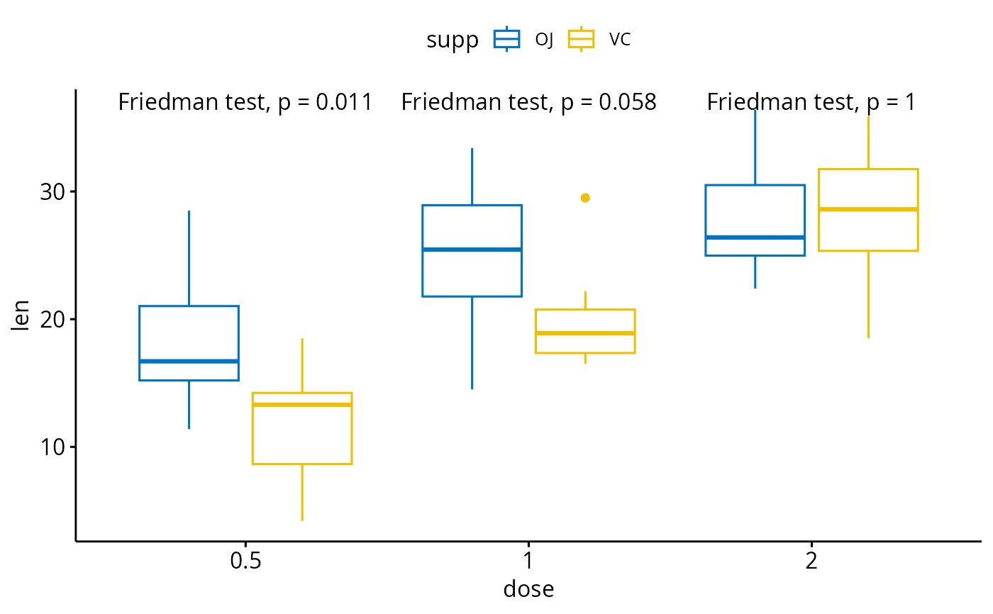 bxp + stat_friedman_test(aes(wid = id, group = supp, color = supp), within = "x")