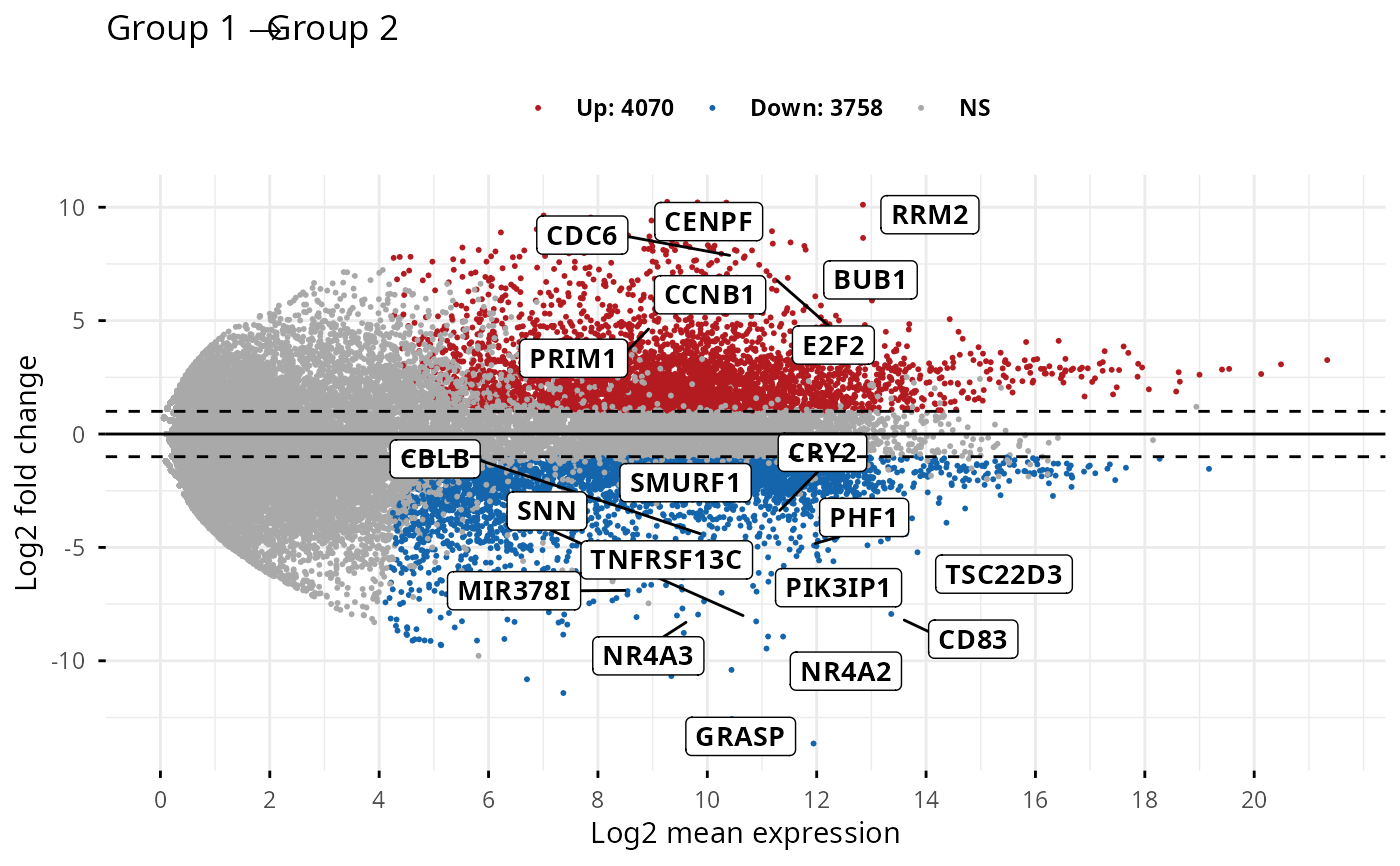 ggmaplot(diff_express, main = expression("Group 1" %->% "Group 2"),