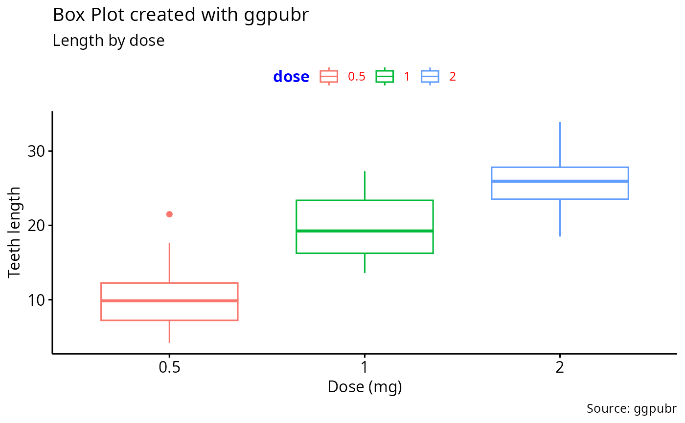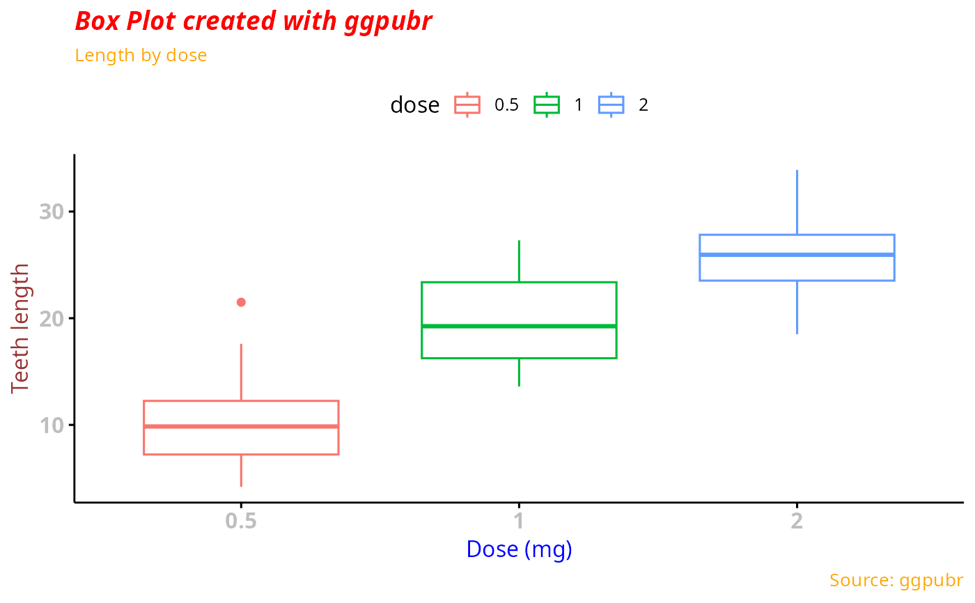 p <- ggboxplot(ToothGrowth, x = "dose", y = "len", color = "dose",