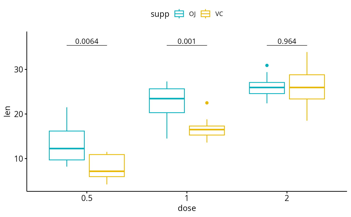 "x.var": Group by the x-axis variable and perform the test between legend groups. In other words, the p-value is compute between legend groups at each x position"legend.var": Group by the legend variable and perform the test between x-axis groups. In other words, the test is performed between the x-groups for each legend level.