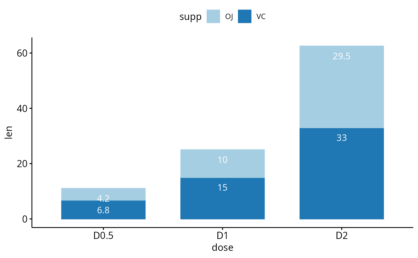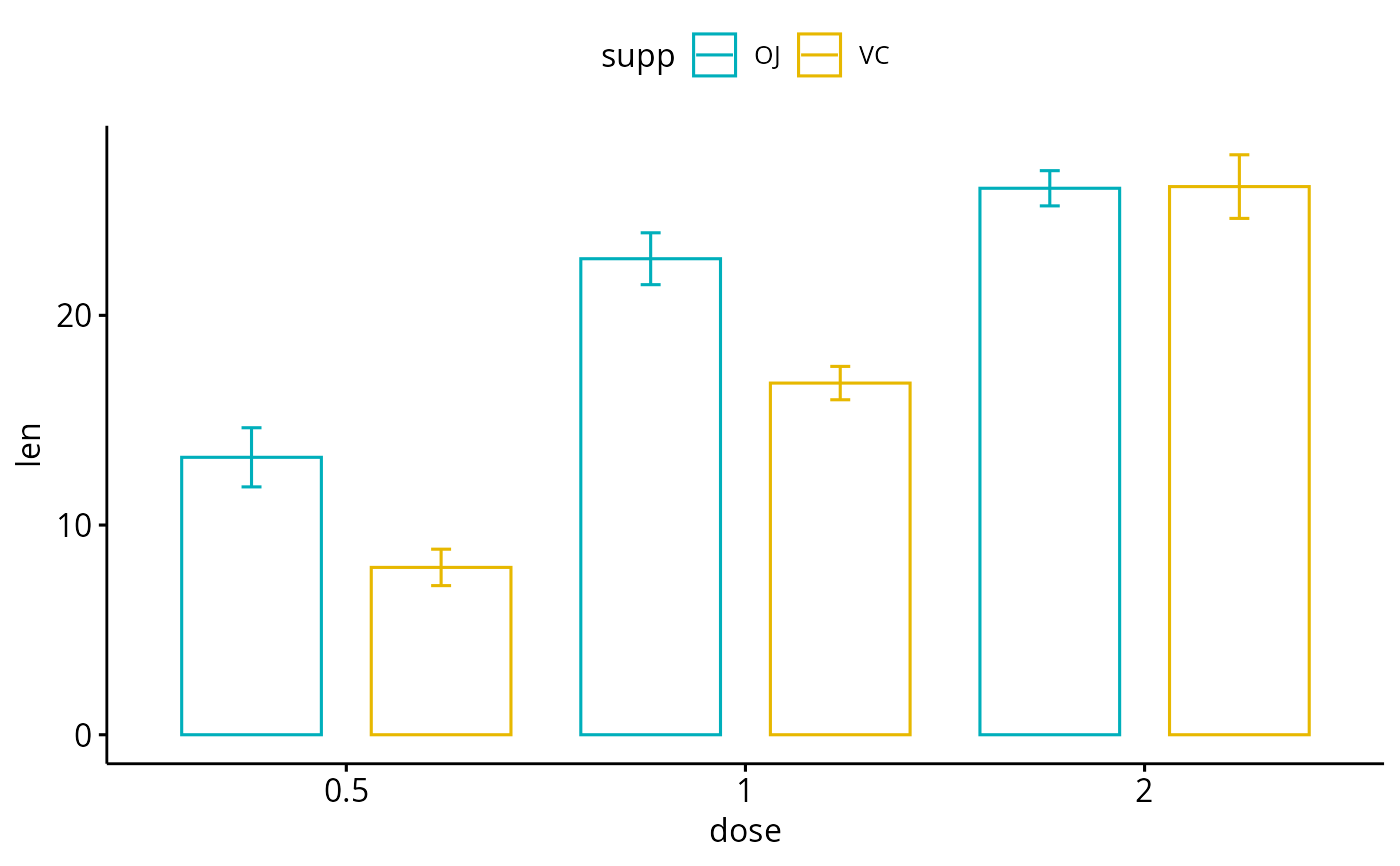 ggbarplot(df3, x = "dose", y = "len", color = "supp",
