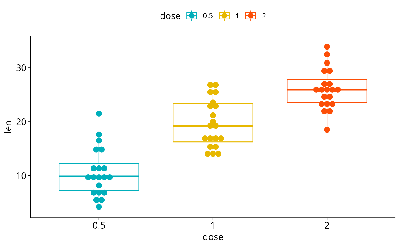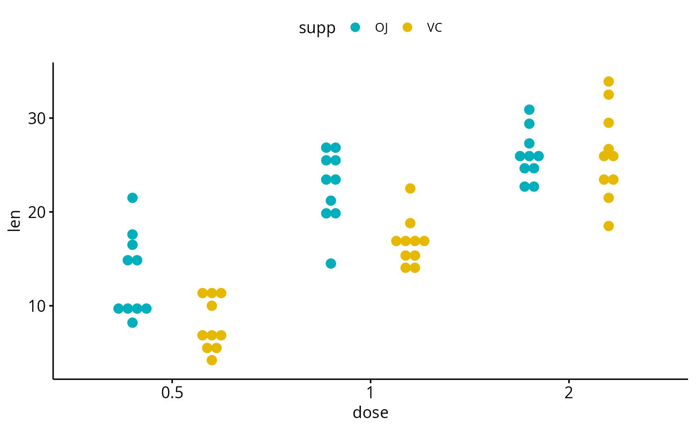 ggdotplot(df, "dose", "len", fill = "supp", color = "supp",