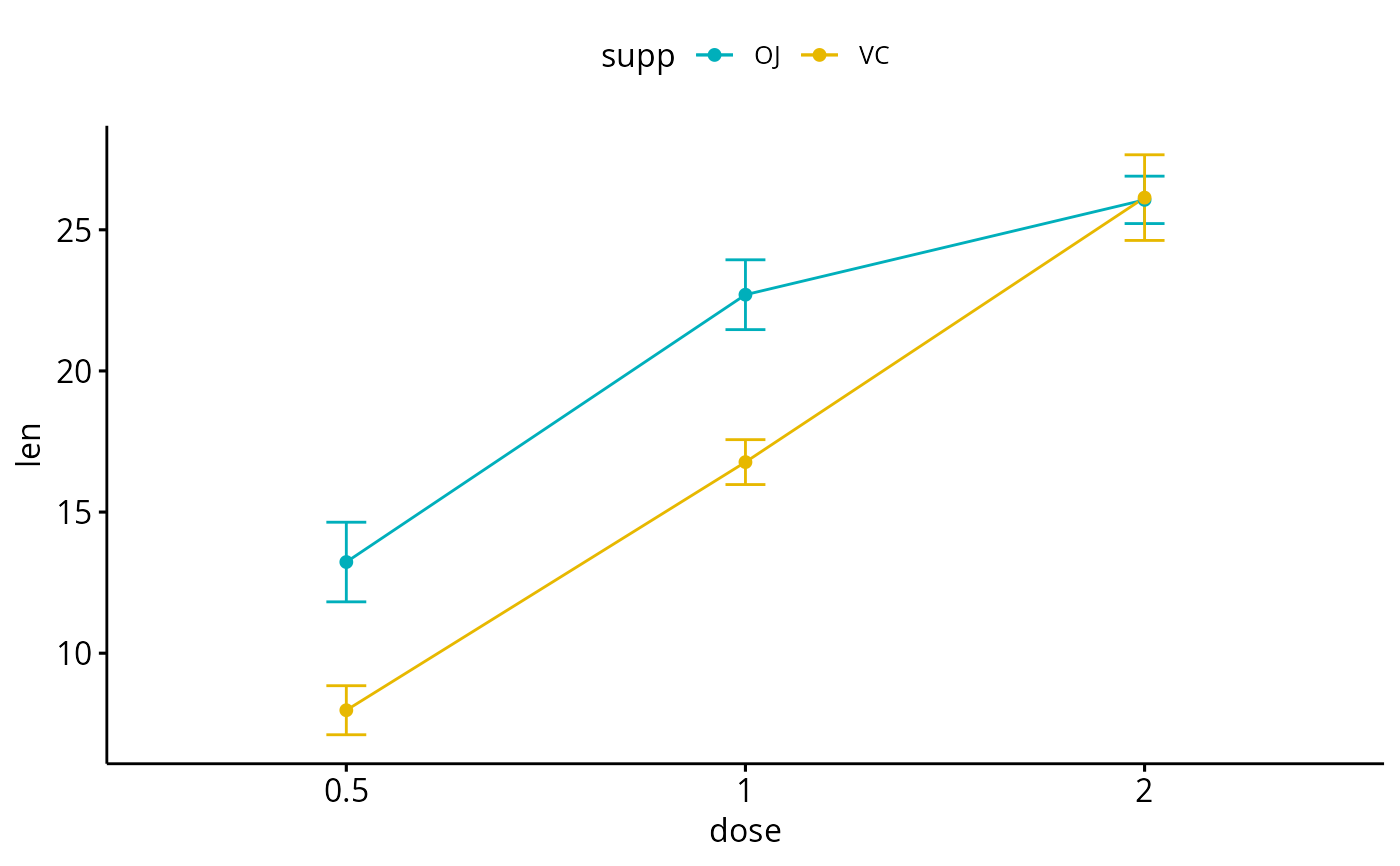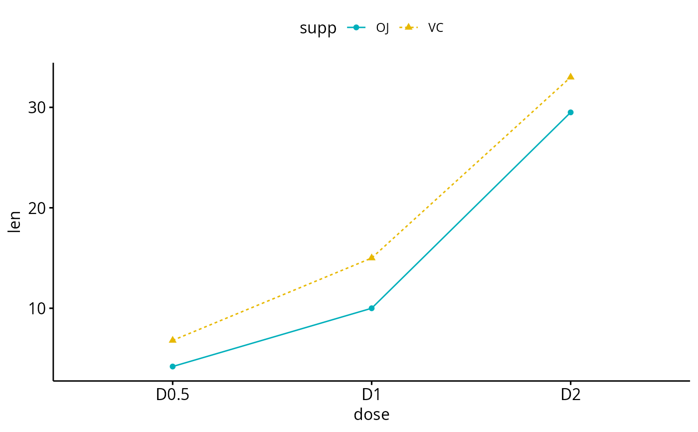 ggline(df3, x = "dose", y = "len", color = "supp",
