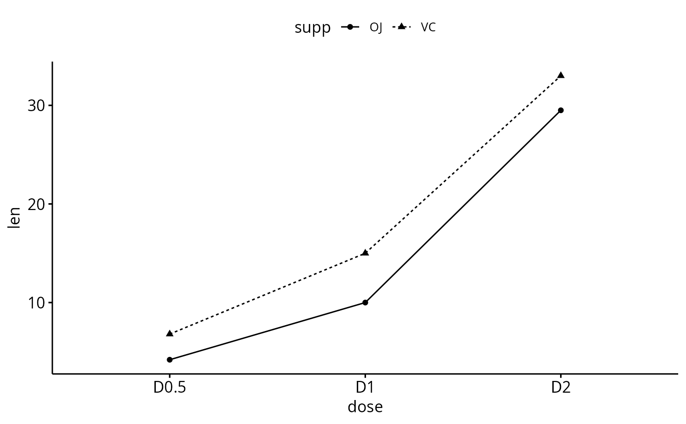# Change line types and point shapes by a second groups: "supp"