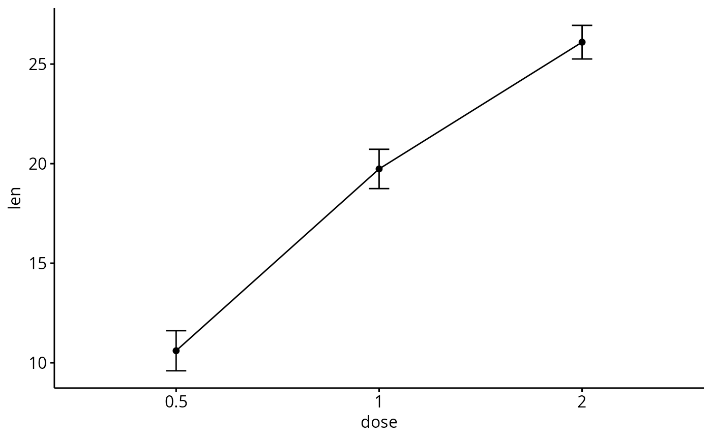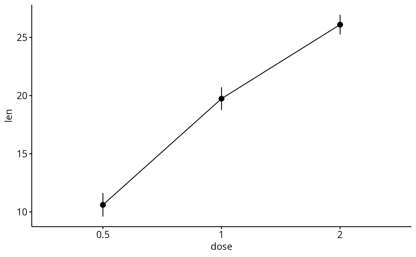 ggline(df3, x = "dose", y = "len", add = "mean_se")