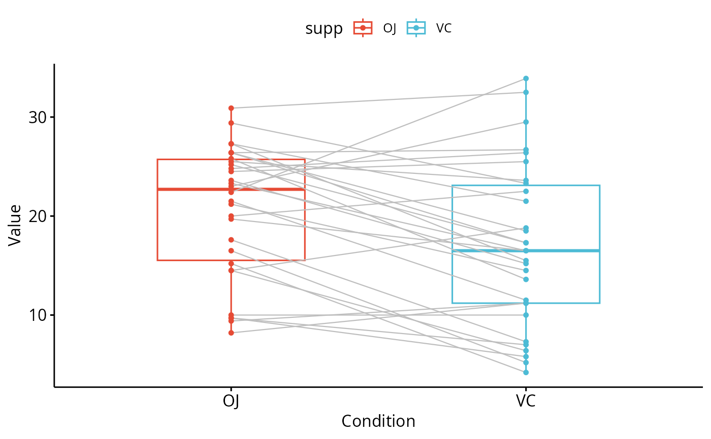 ggpaired(ToothGrowth, x = "supp", y = "len",