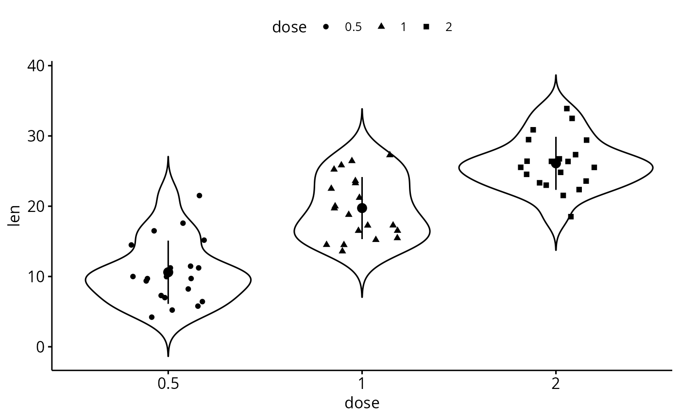 shape = "dose", add = c("violin", "mean_sd"))