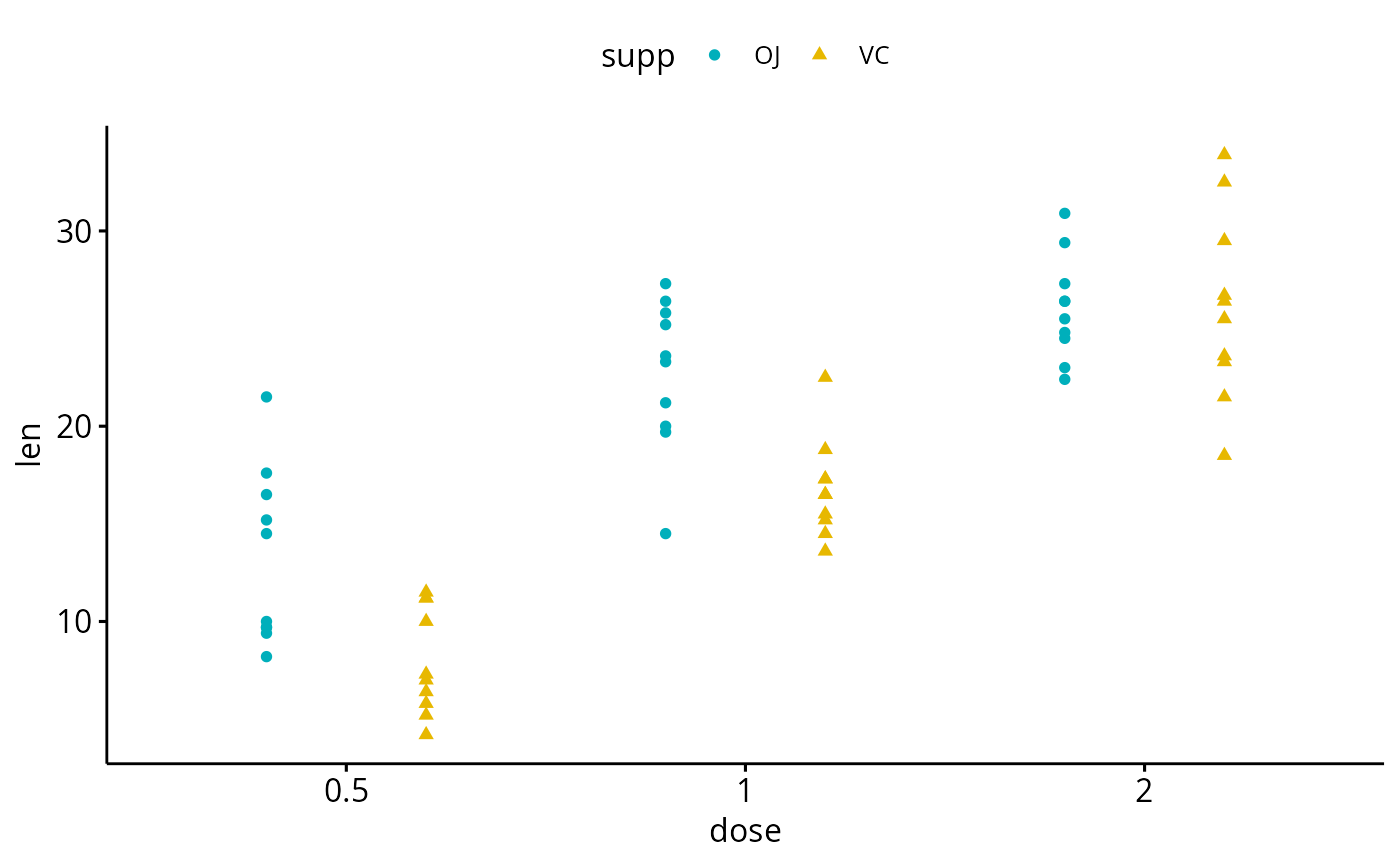 ggstripchart(df, "dose", "len", shape = "supp",