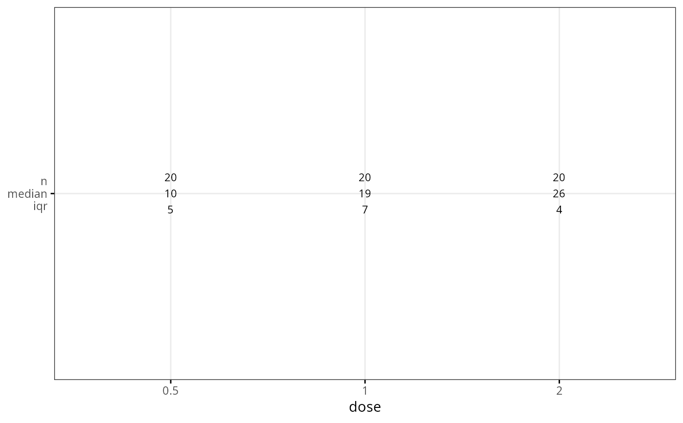 summary.stats, x = "dose", y = c("n", "median", "iqr"),