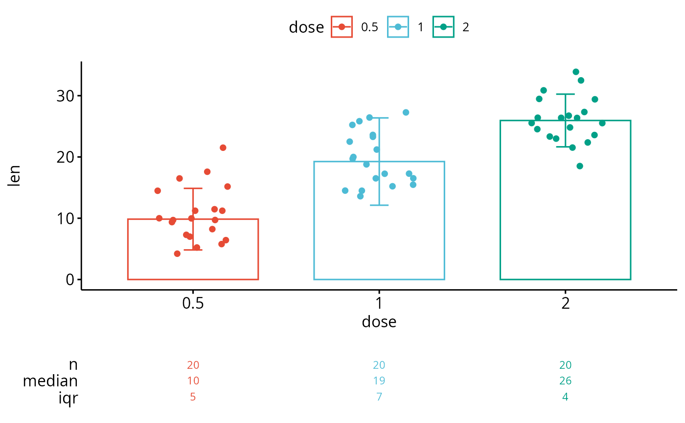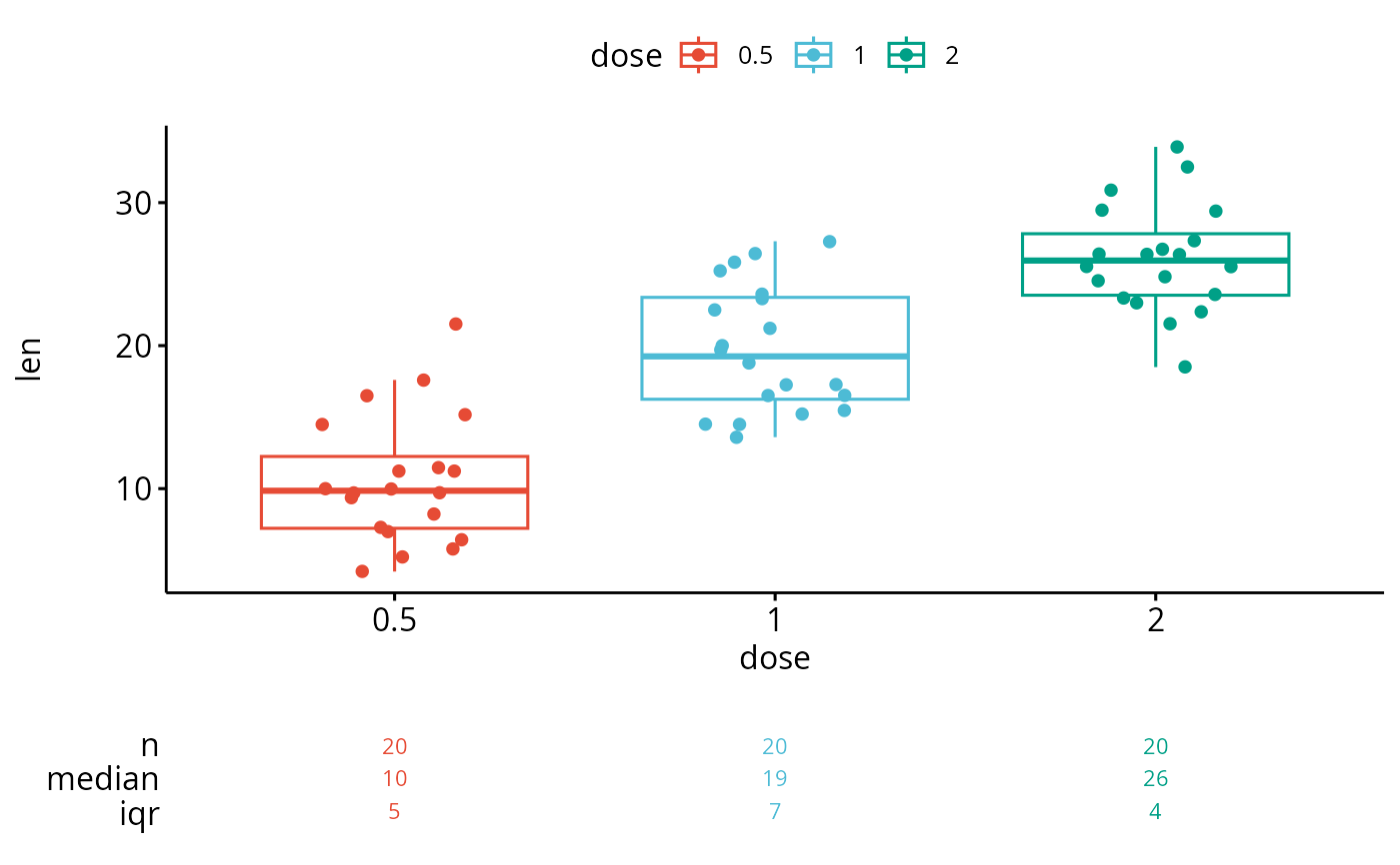 Create a ggplot with summary stats (n, median, mean, iqr) table under the plot. Read more: How to Create a Beautiful Plots in R with Summary Statistics Labels.