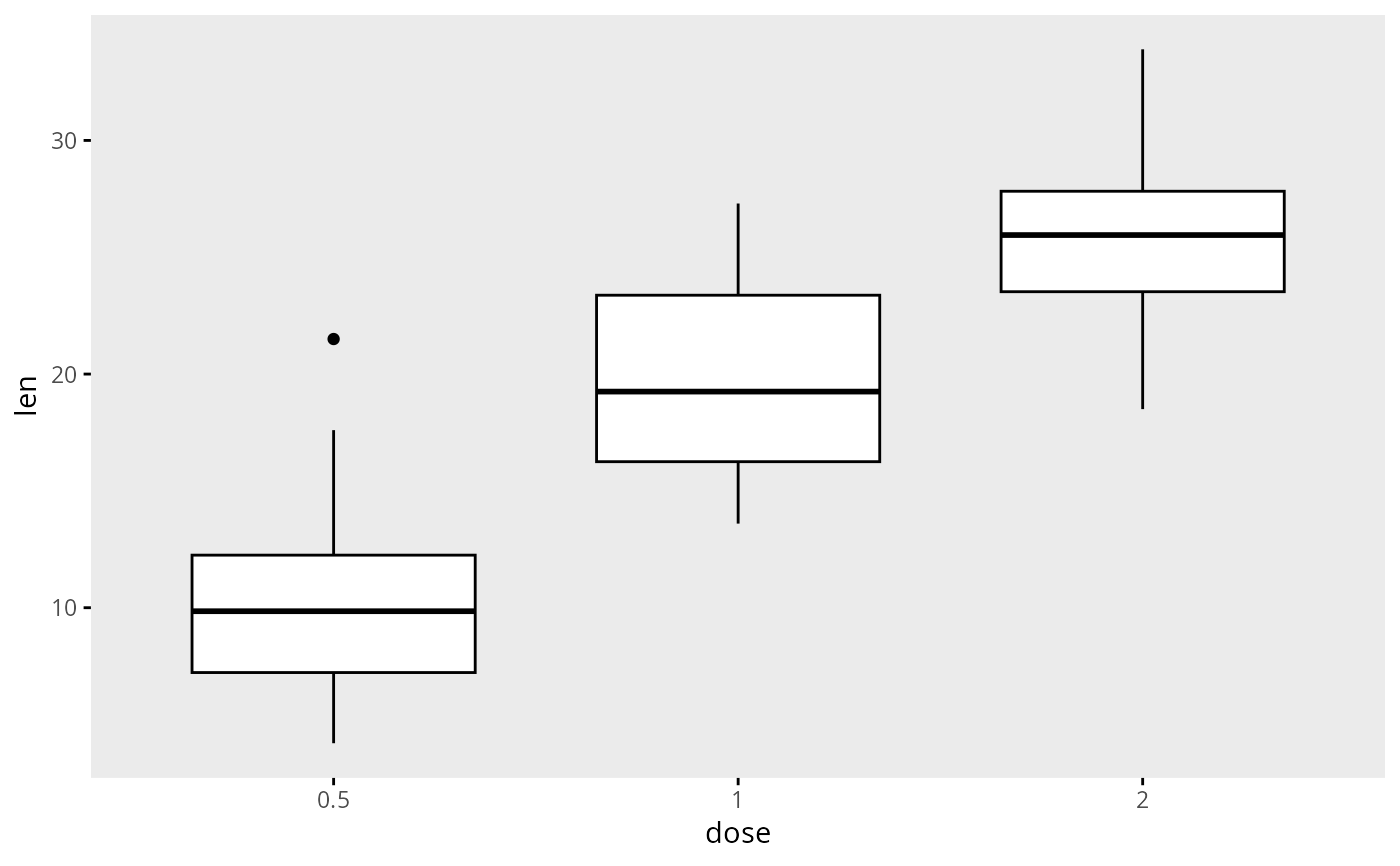 p <- ggboxplot(ToothGrowth, x = "dose", y = "len",