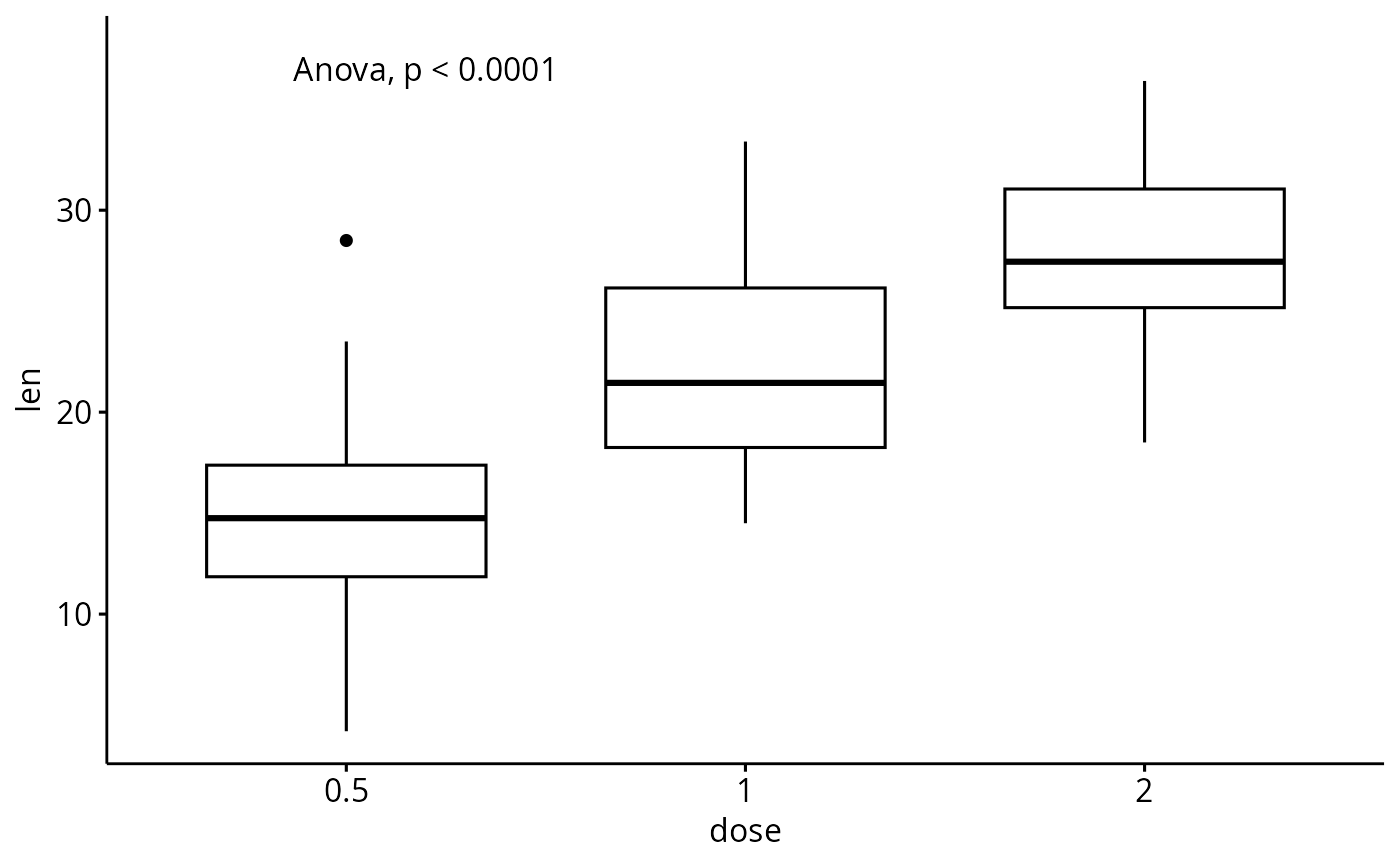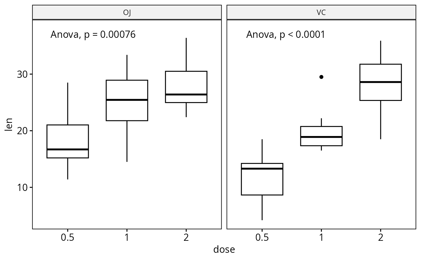 bxp2 + stat_anova_test(aes(group = dose), label = "p = {p.format}{p.signif}")