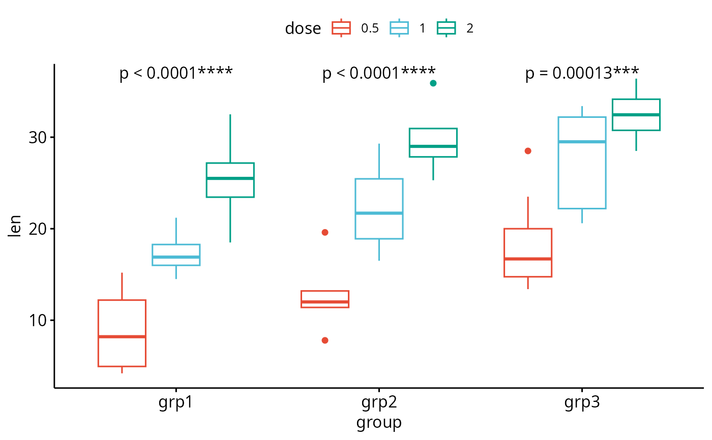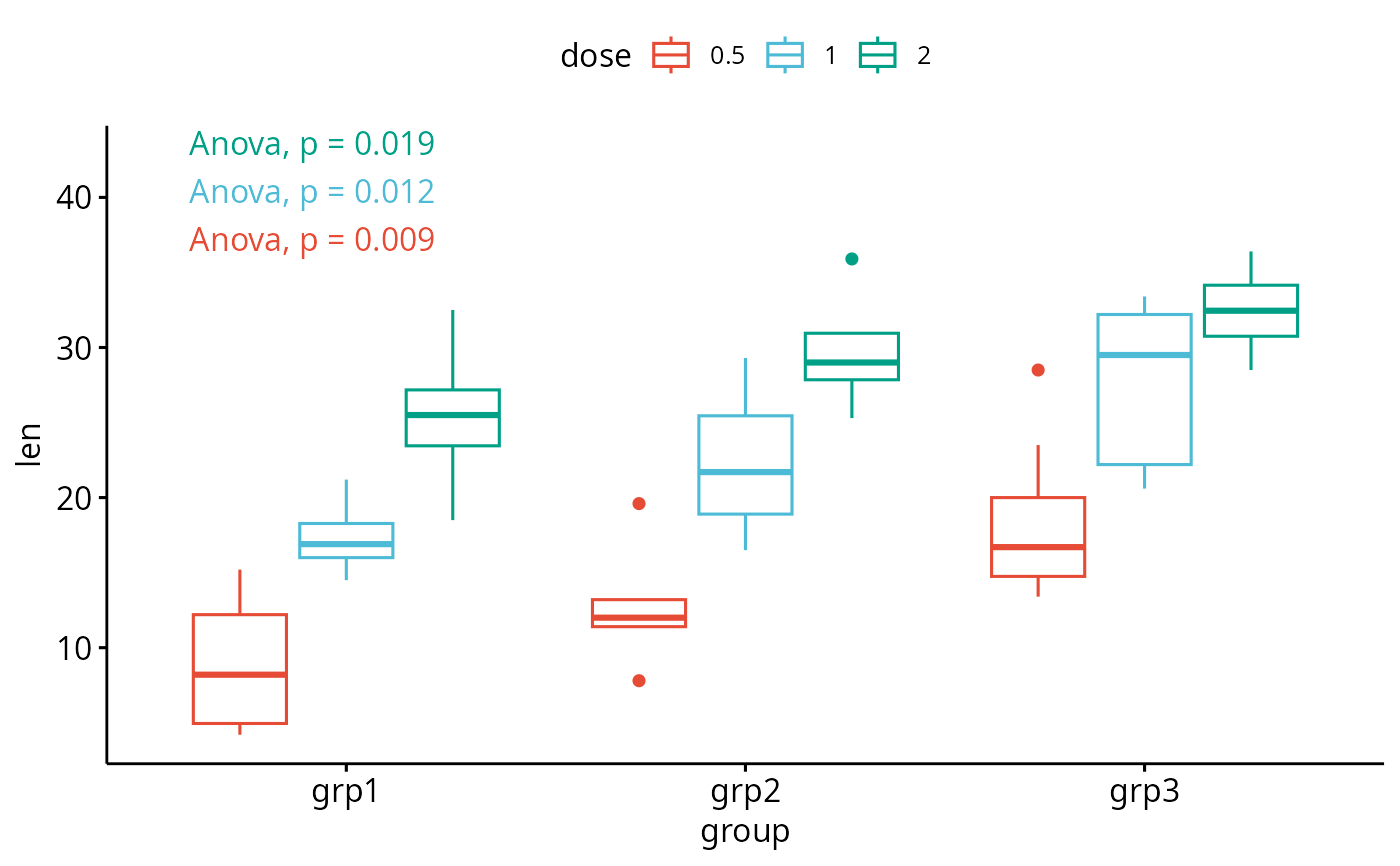 bxp2 + stat_anova_test(aes(group = dose, color = dose), group.by = "legend.var")