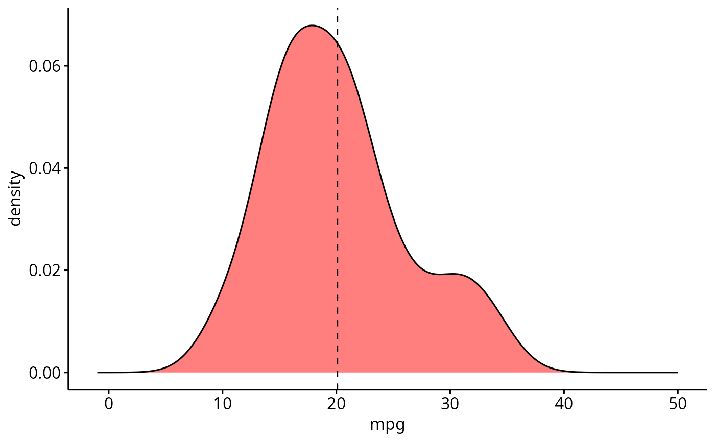 ggdensity(mtcars, x = "mpg", fill = "red") +